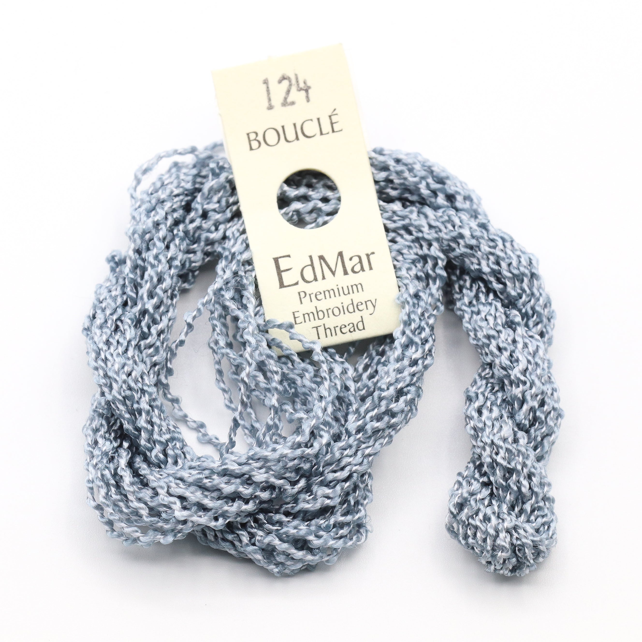 This is Boucle from EdMar in color 124 Light Gray. 2 or 3 ply on 13 mesh, 1 ply on 18 mesh. Great for trees, clouds, water, or fur. Also try couching it for a different effect!