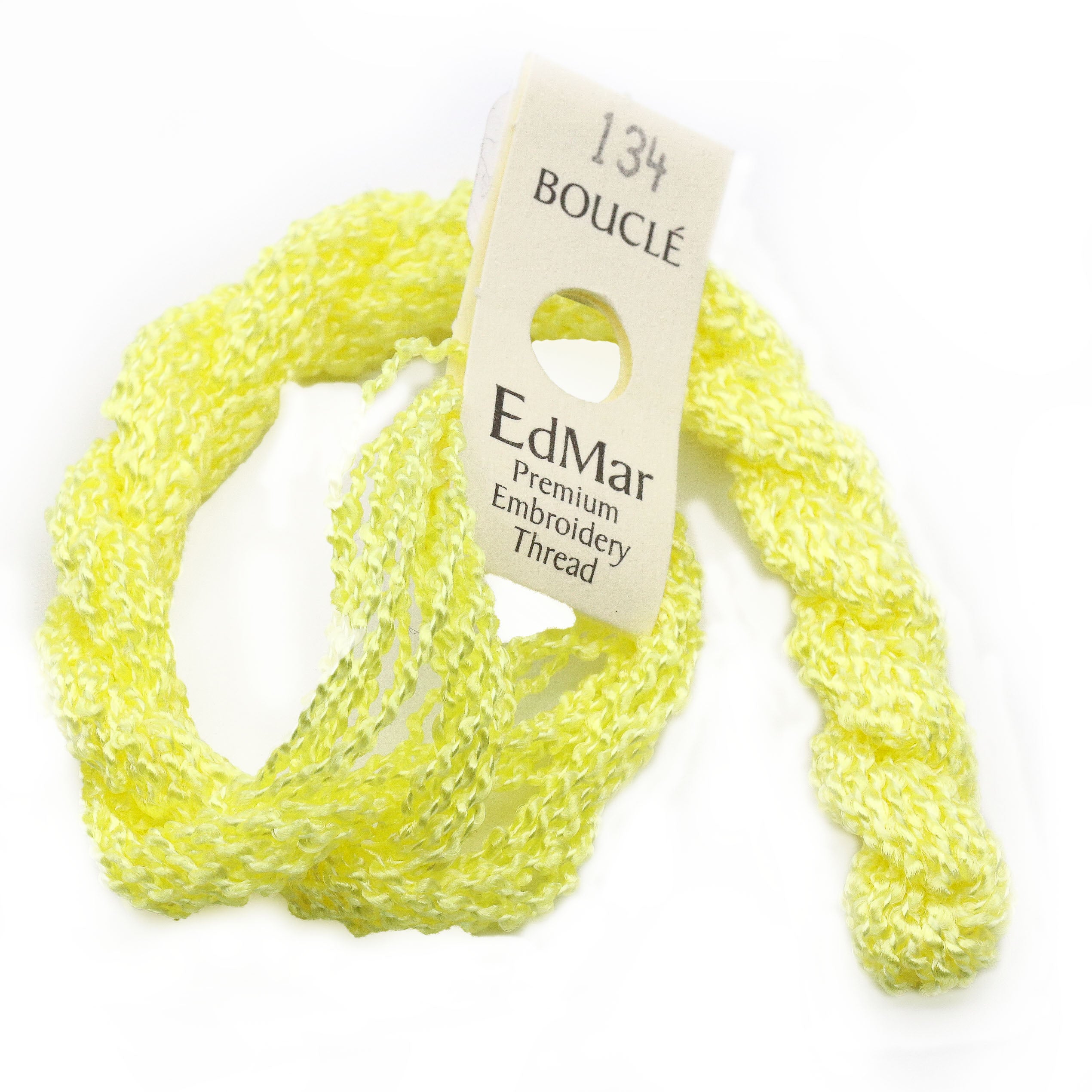 This is Boucle from EdMar in color 134 Light Yellow. 2 or 3 ply on 13 mesh, 1 ply on 18 mesh. Great for trees, clouds, water, or fur. Also try couching it for a different effect!