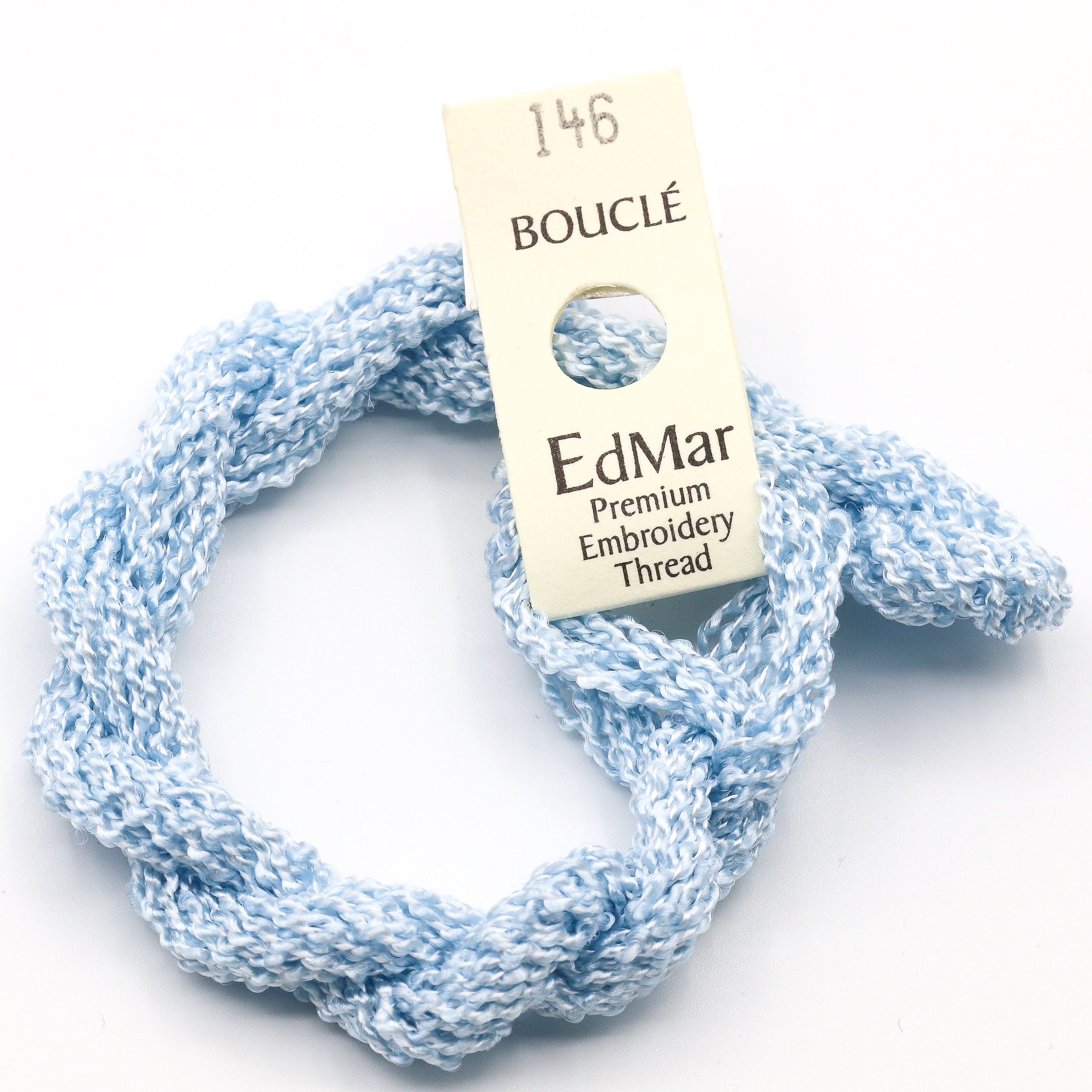 This is Boucle from EdMar in color 146 Light Colonial Blue. 2 or 3 ply on 13 mesh, 1 ply on 18 mesh. Great for trees, clouds, water, or fur. Also try couching it for a different effect!