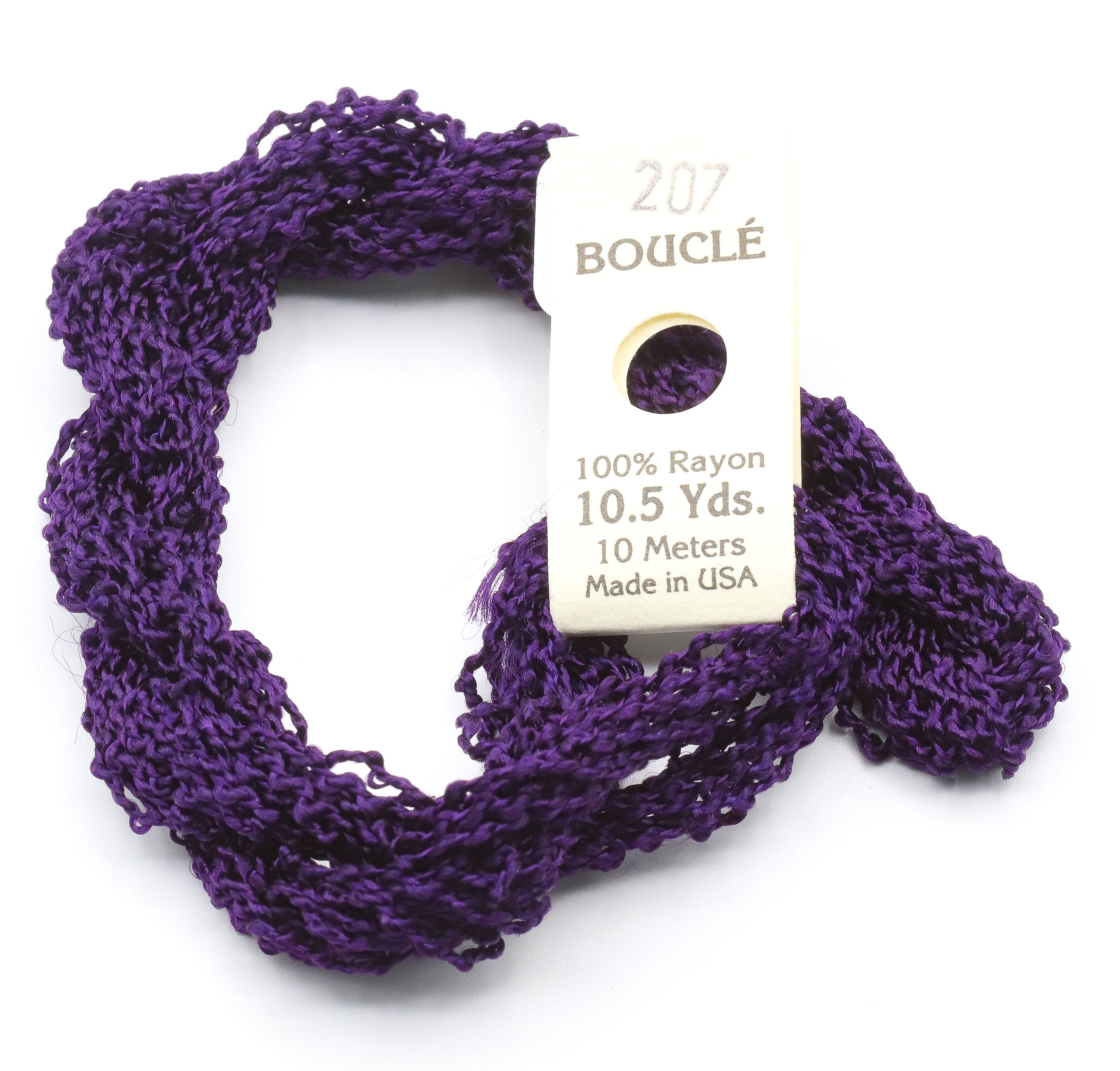 This is Boucle from EdMar in color 207 Dark Grape. 2 or 3 ply on 13 mesh, 1 ply on 18 mesh. Great for trees, clouds, water, or fur. Also try couching it for a different effect!