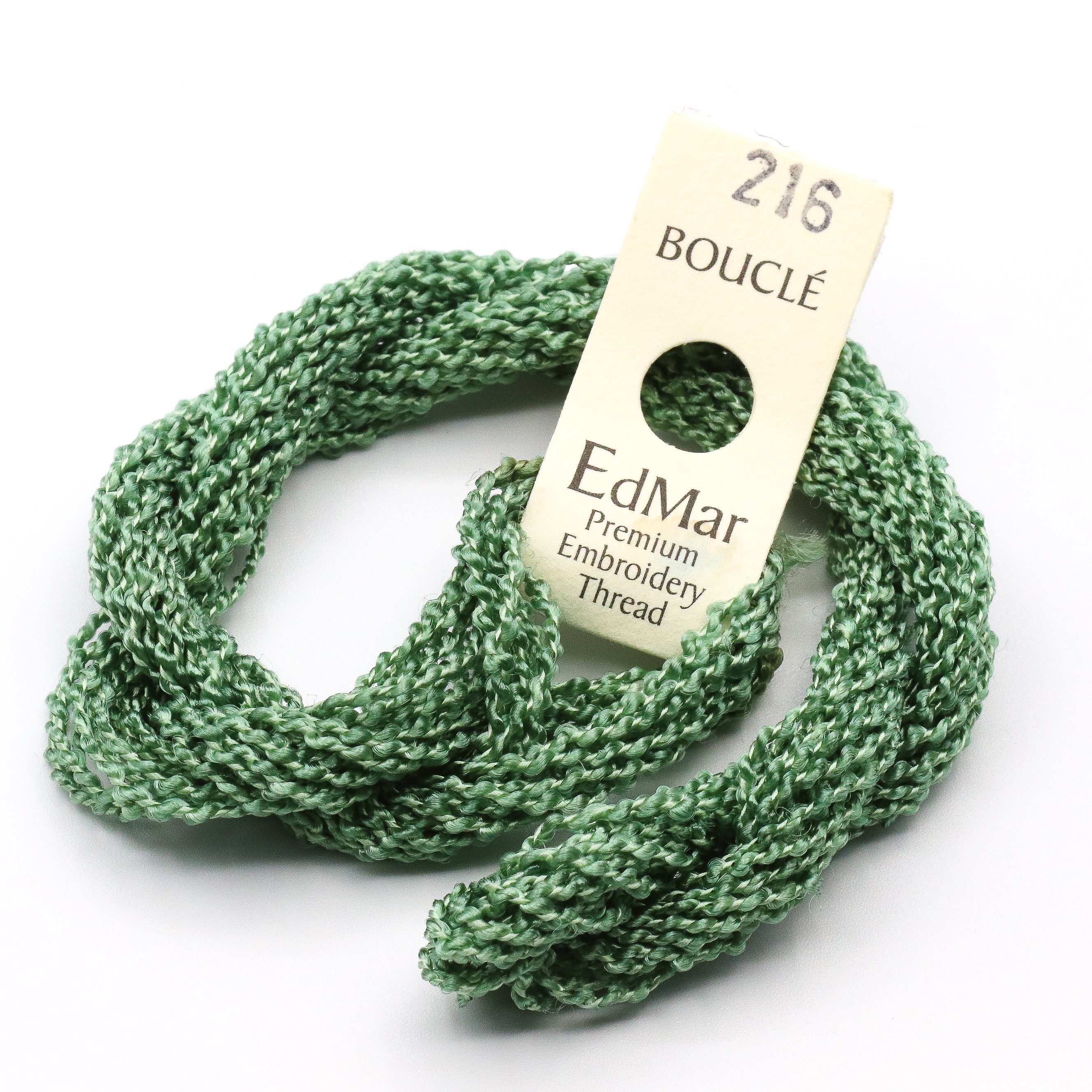 This is Boucle from EdMar in color 216 Spruce. 2 or 3 ply on 13 mesh, 1 ply on 18 mesh. Great for trees, clouds, water, or fur. Also try couching it for a different effect!