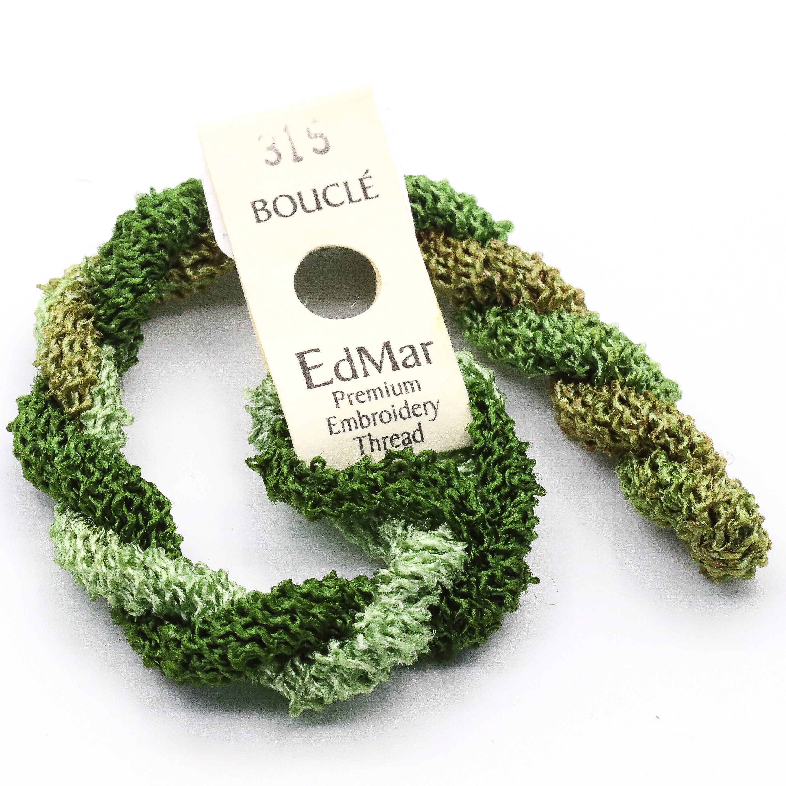 This is Boucle from EdMar in color 315 Medium and Pale Bay Leaf and Hazel. 2 or 3 ply on 13 mesh, 1 ply on 18 mesh. Great for trees, clouds, water, or fur. Also try couching it for a different effect!