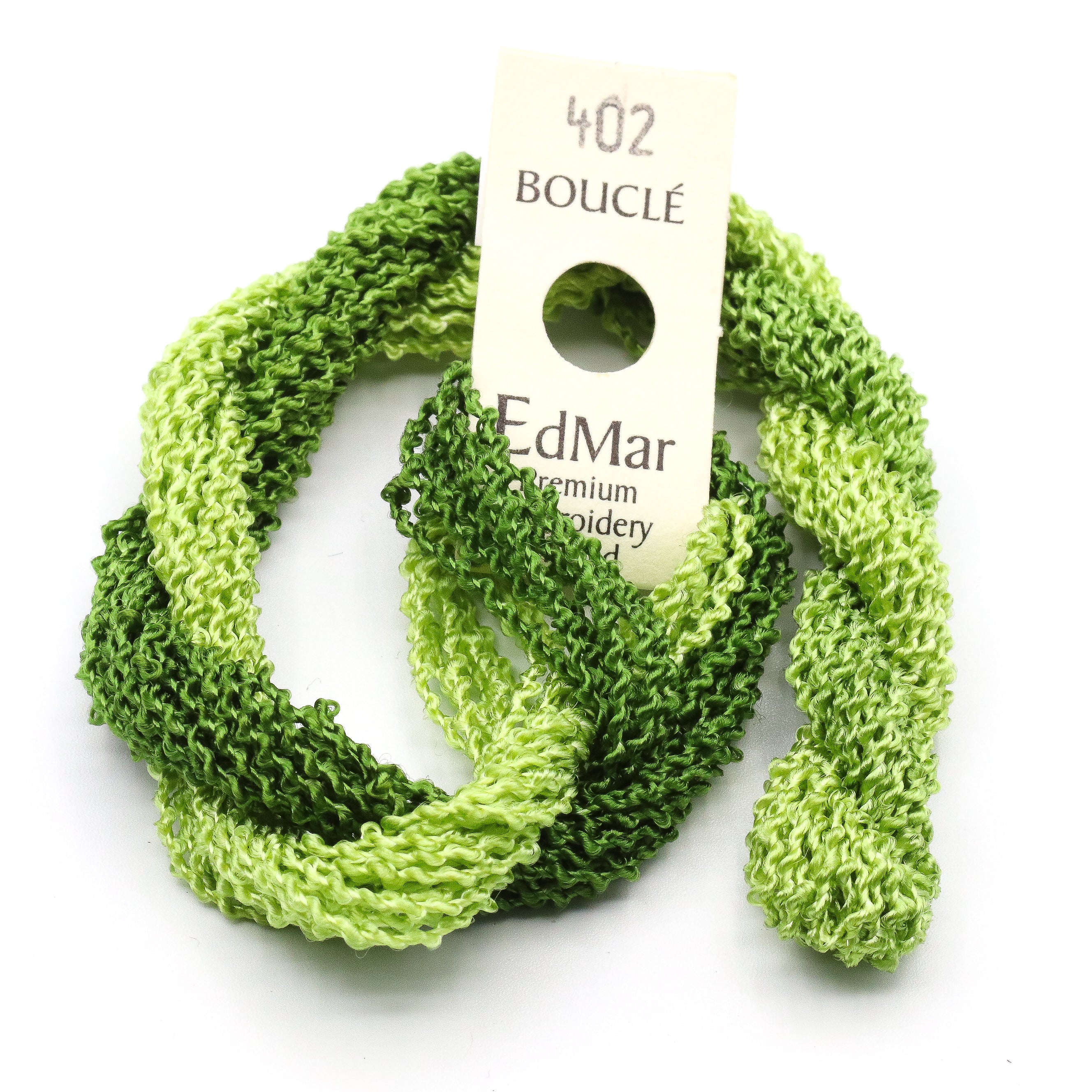 This is Boucle from EdMar in color 402 Medium to Light Peridot. 2 or 3 ply on 13 mesh, 1 ply on 18 mesh. Great for trees, clouds, water, or fur. Also try couching it for a different effect!