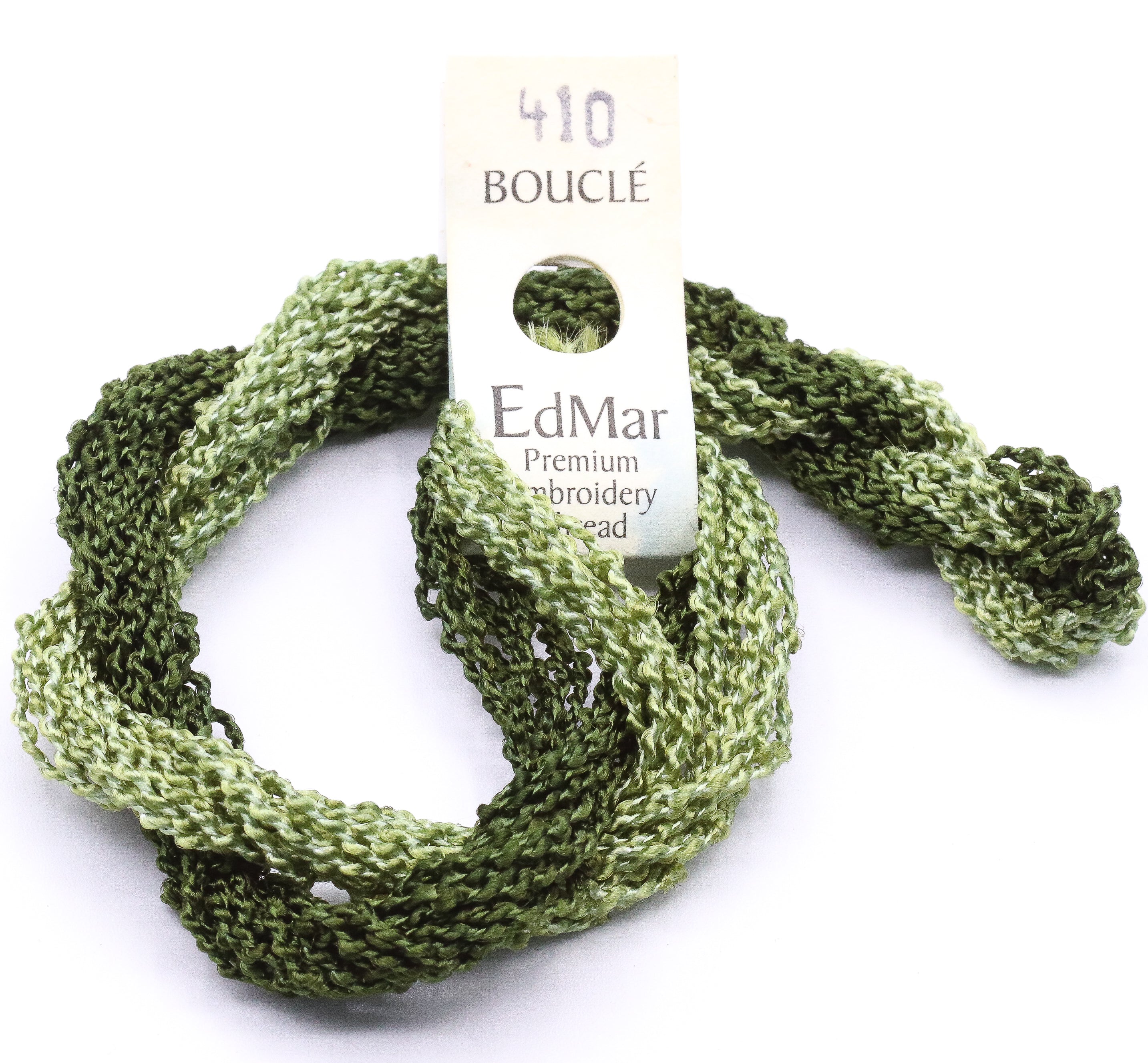 This is Boucle from EdMar in color 410 Medium to Pale Bay Leaf. 2 or 3 ply on 13 mesh, 1 ply on 18 mesh. Great for trees, clouds, water, or fur. Also try couching it for a different effect!