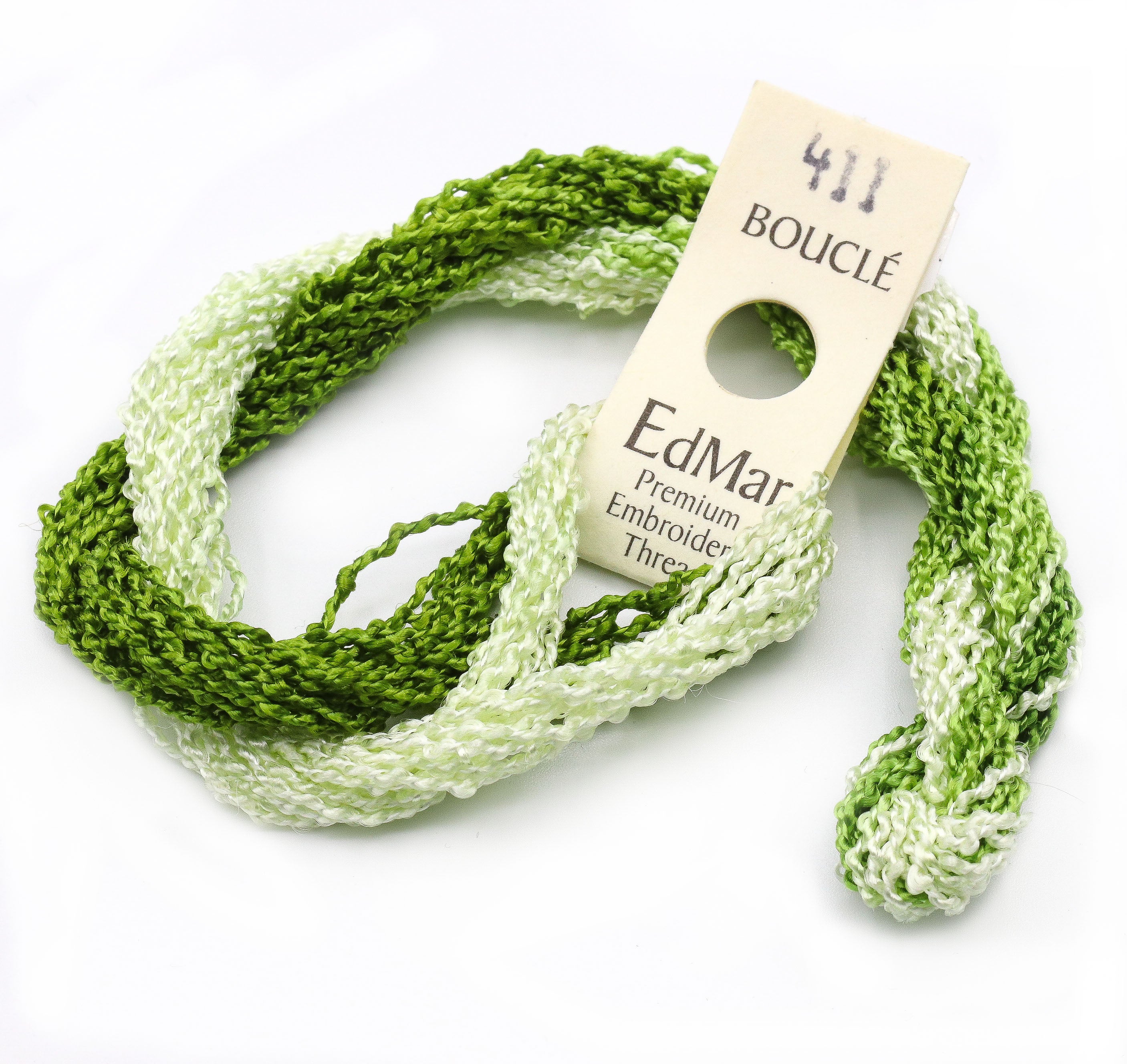 This is Boucle from EdMar in color 411 Medium to Whisper Olive. 2 or 3 ply on 13 mesh, 1 ply on 18 mesh. Great for trees, clouds, water, or fur. Also try couching it for a different effect!