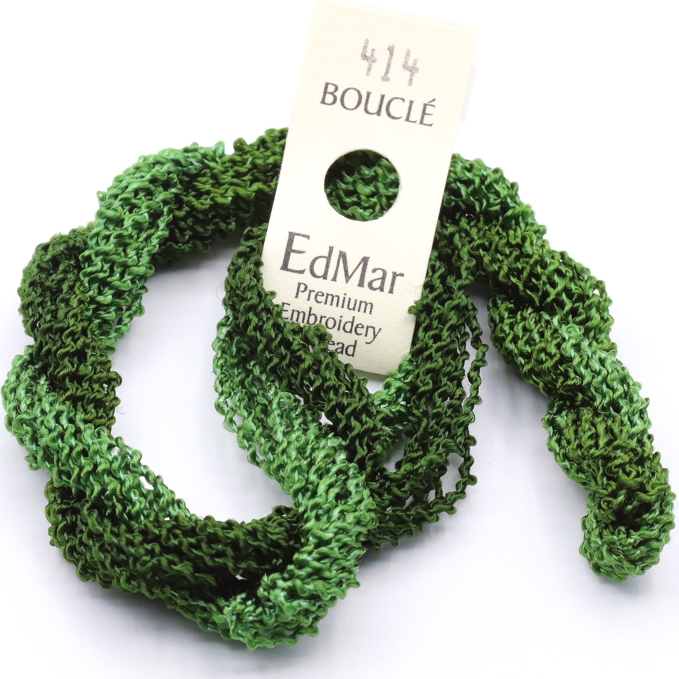 This is Boucle from EdMar in color 414 Medium to Light Forest Green. 2 or 3 ply on 13 mesh, 1 ply on 18 mesh. Great for trees, clouds, water, or fur. Also try couching it for a different effect!