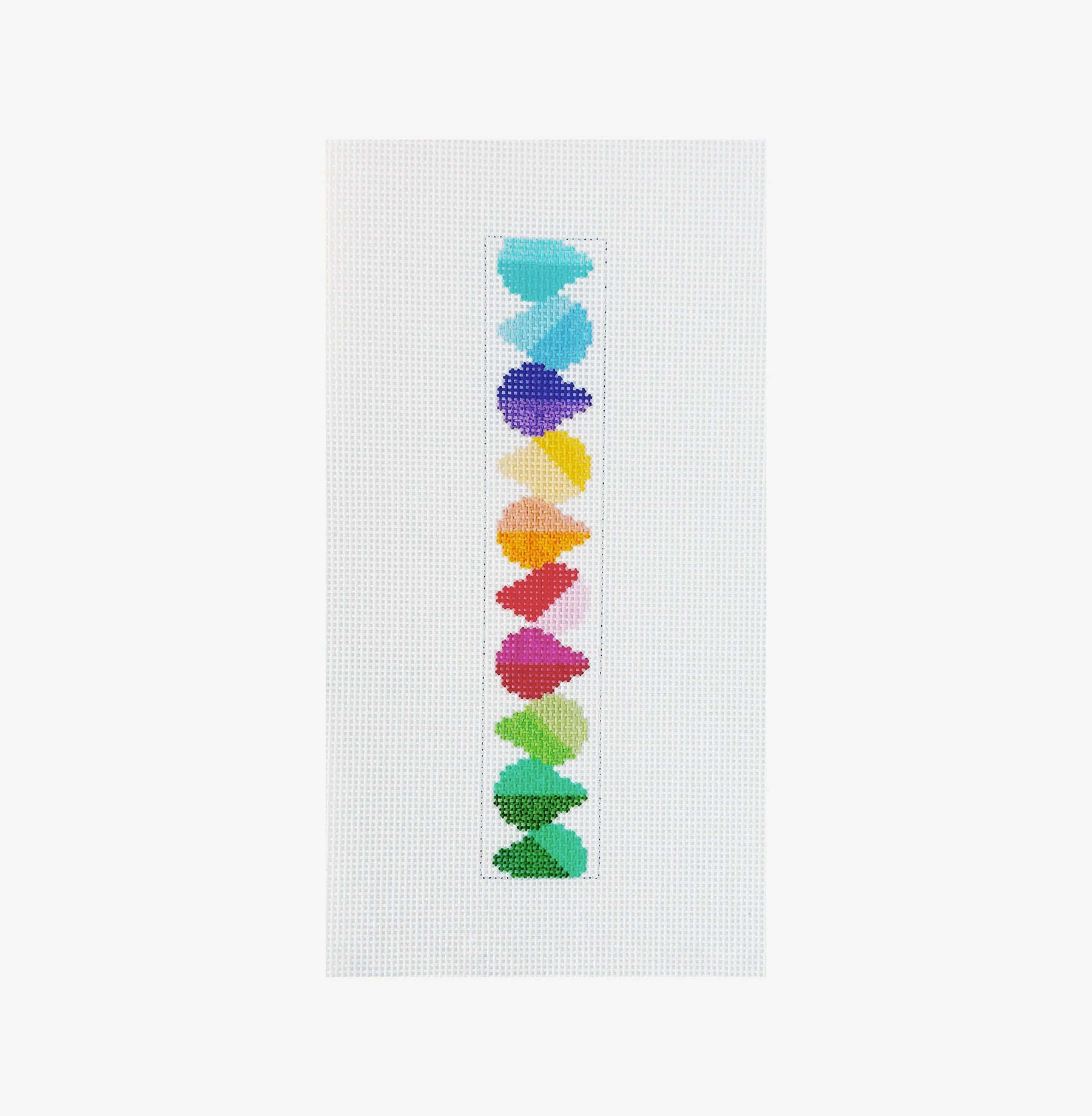 The Garden design is a vertical and colorful version of Elizabeth Crane Swartz's most iconic design featuring a tumble of circles in half and half colors. The design is hand painted on this picture frame needlepoint canvas.