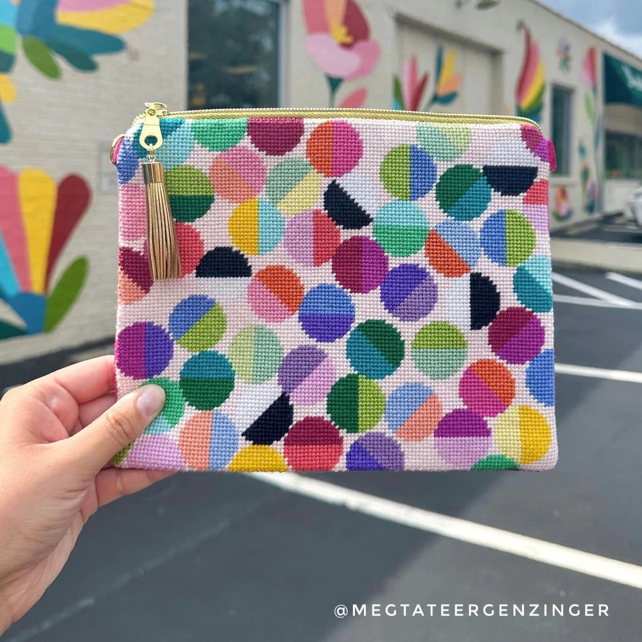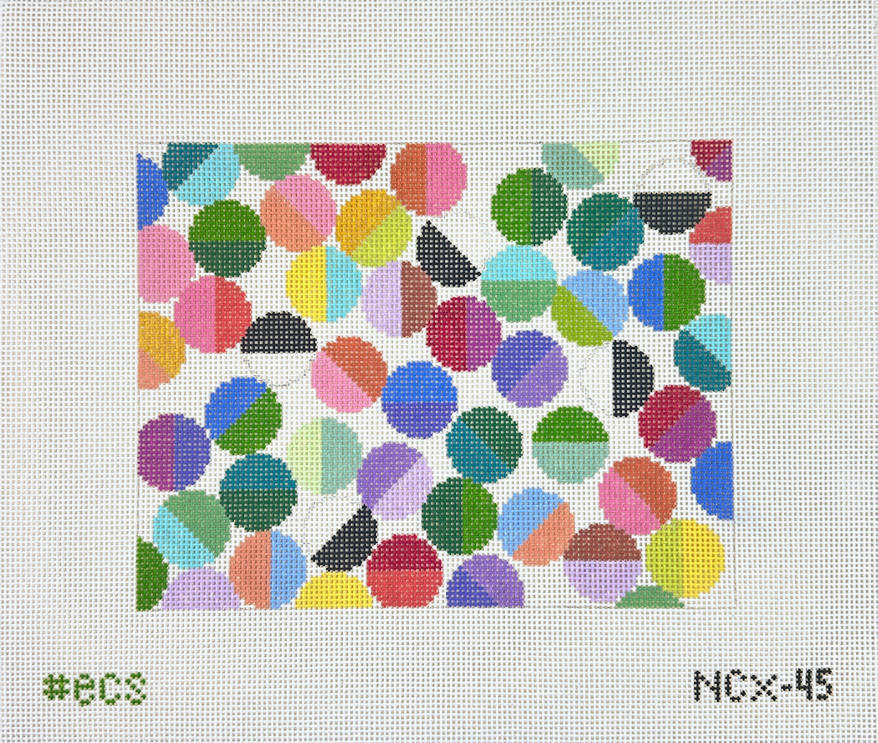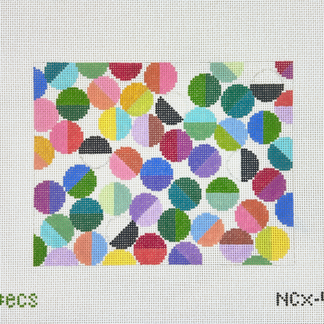 The Lulu design is Elizabeth Crane Swartz's most iconic design featuring a tumble of circles in half and half colors. The background could be any color, but the designer suggests Pink Lemonade by Silk and Ivory (color 111). The design is hand painted on this clutch needlepoint canvas that can be finished as a zip pouch clutch purse. Stitched examples shown for inspiration, materials and finishing services sold separately.