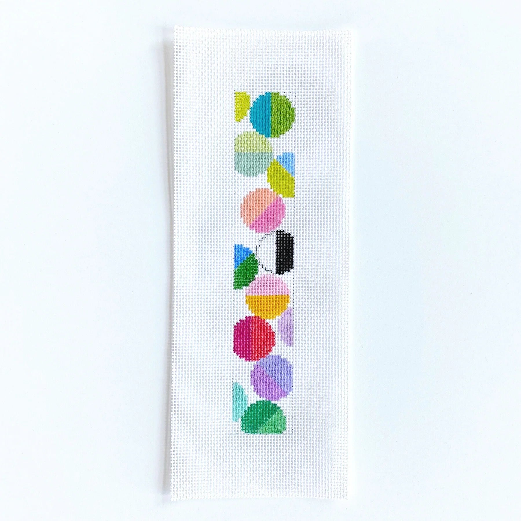The Lulu design is Elizabeth Crane Swartz's most iconic design featuring a tumble of circles in half and half colors. The background could be any color, but the designer suggests Pink Lemonade by Silk and Ivory (color 111). The design is hand painted on this needlepoint canvas that can be finished as either a key fob or bookmark.