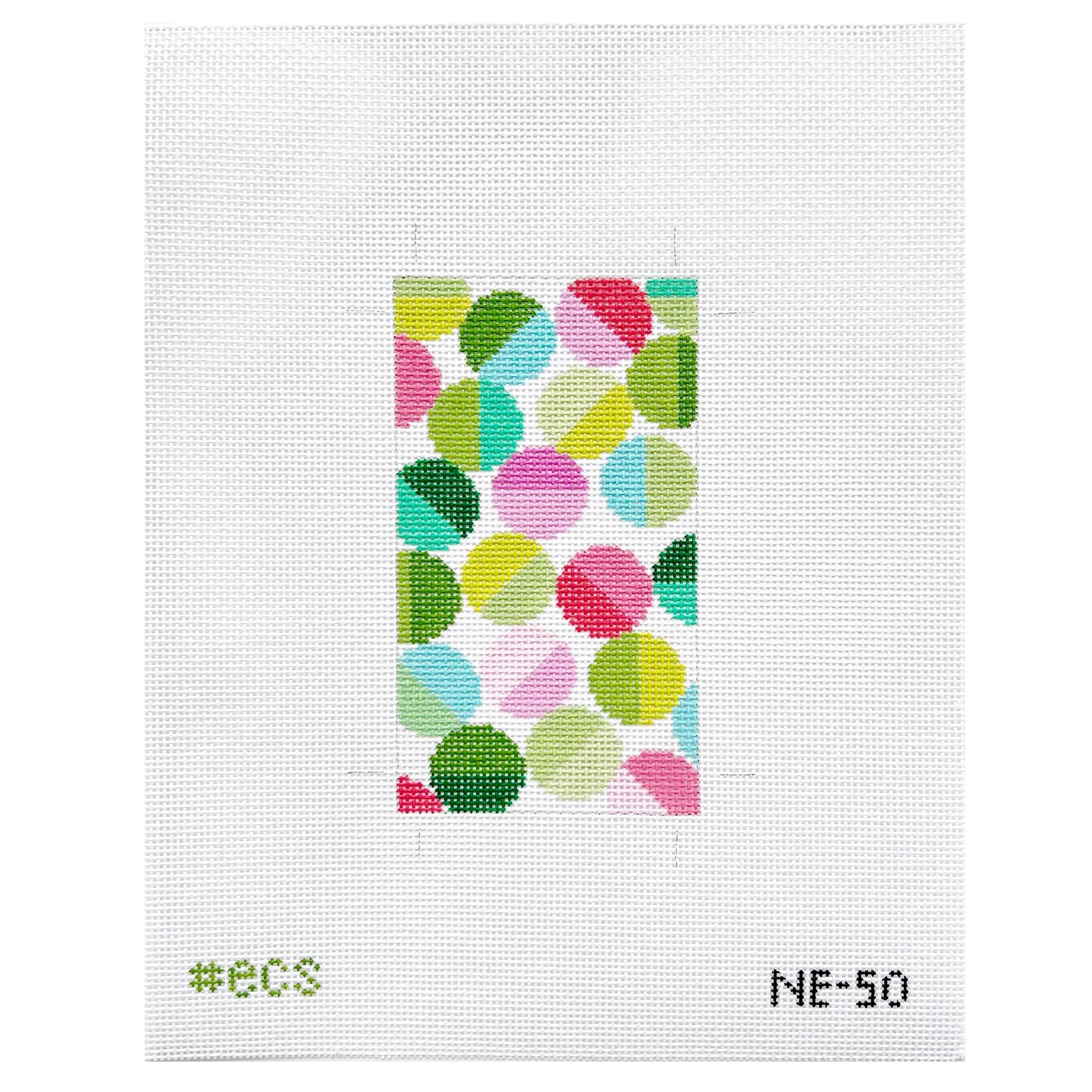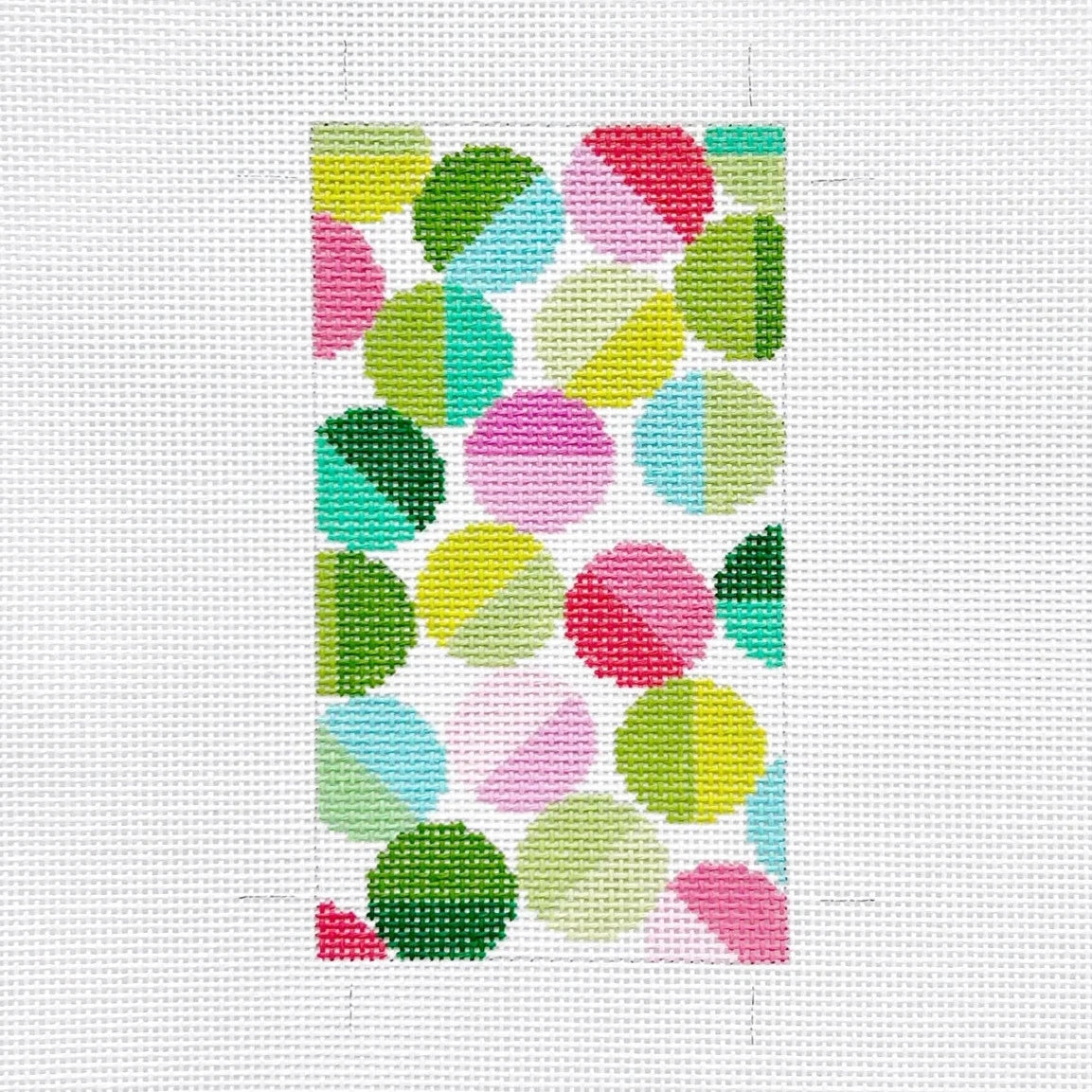 The Mimi design is a green and pink version of Elizabeth Crane Swartz's most iconic design featuring a tumble of circles in half and half colors. The design is hand painted on this needlepoint canvas that can be finished as an eyeglass case or used in some self-finishing styles.