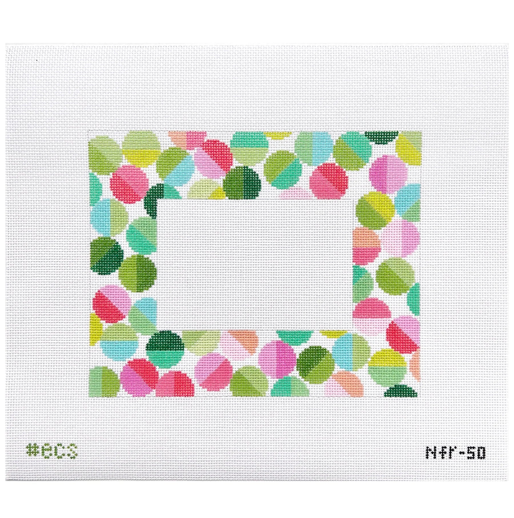 The Mimi design is a pink and green version of Elizabeth Crane Swartz's most iconic design featuring a tumble of circles in half and half colors. The design is hand painted on this picture frame needlepoint canvas.