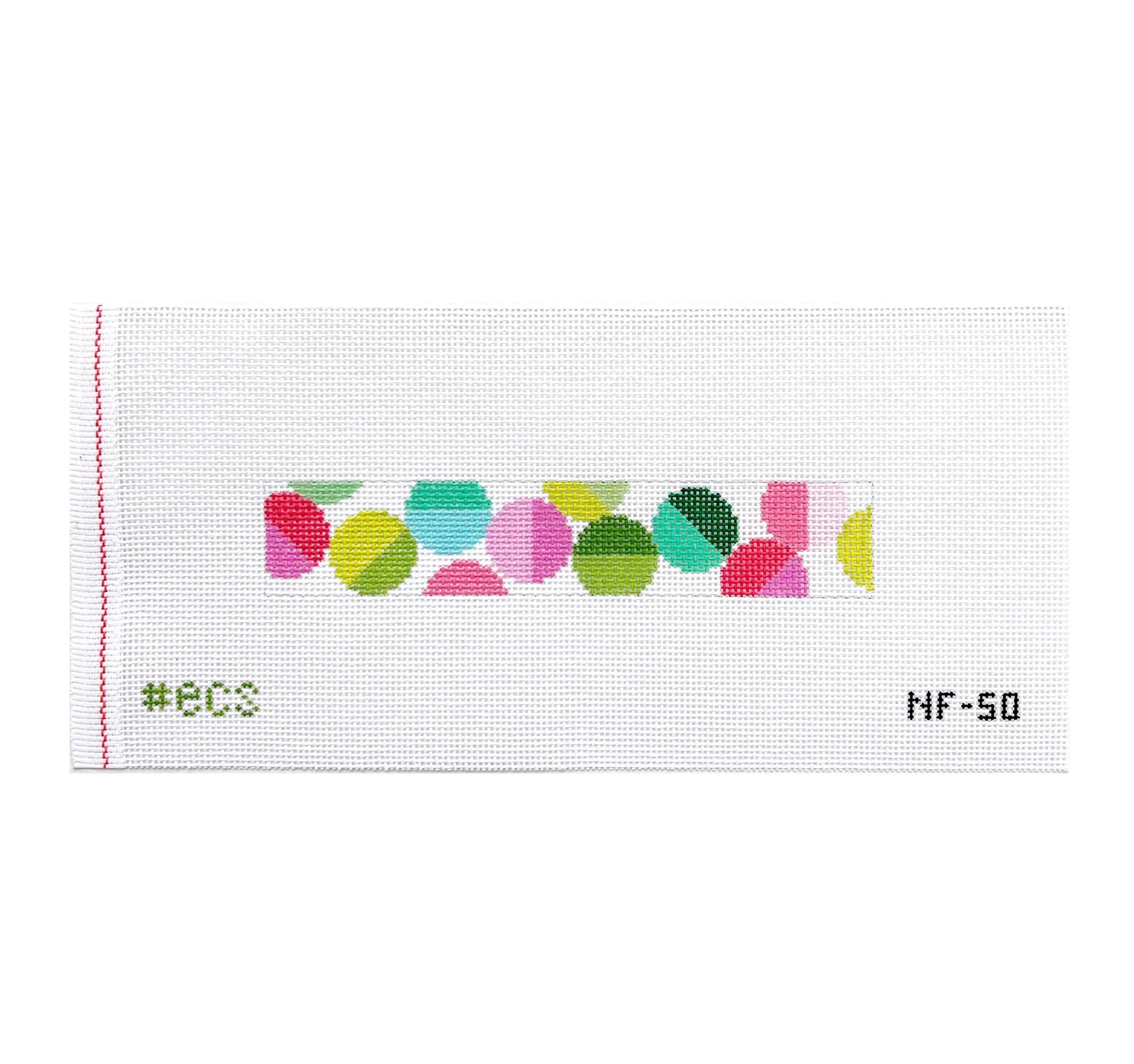 The Mimi design is a green and pink version of Elizabeth Crane Swartz's most iconic design featuring a tumble of circles in half and half colors. The design is hand painted on this needlepoint canvas that can be finished as a folded key fob or bookmark.