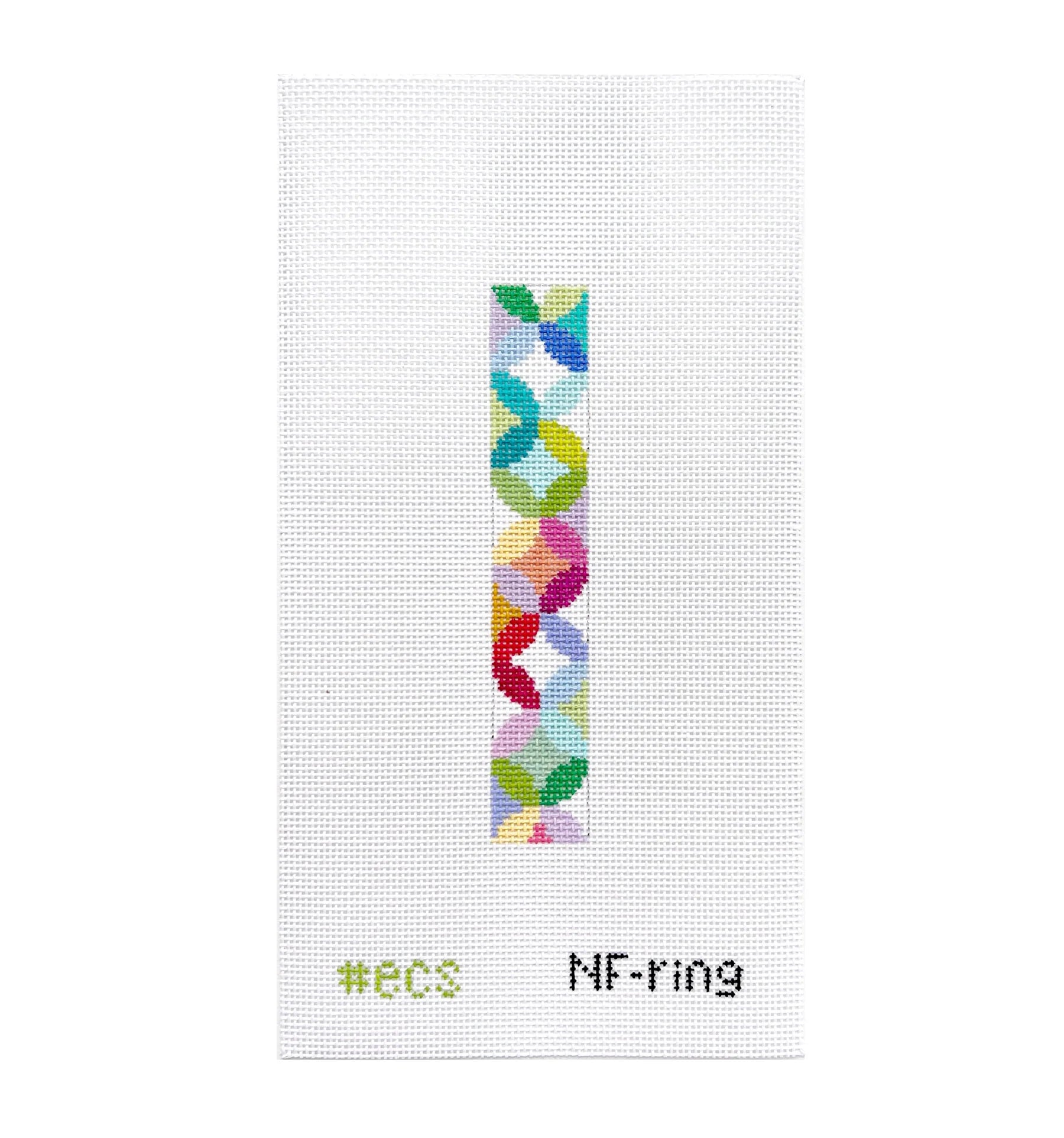 Inspired by the ‘orange peel’ quilt pattern, this hand painted needlepoint canvas by Elizabeth Crane Swartz Designs features a secondary circular design, using color and negative space. This canvas is perfect to be finished as either a key fob or bookmark.