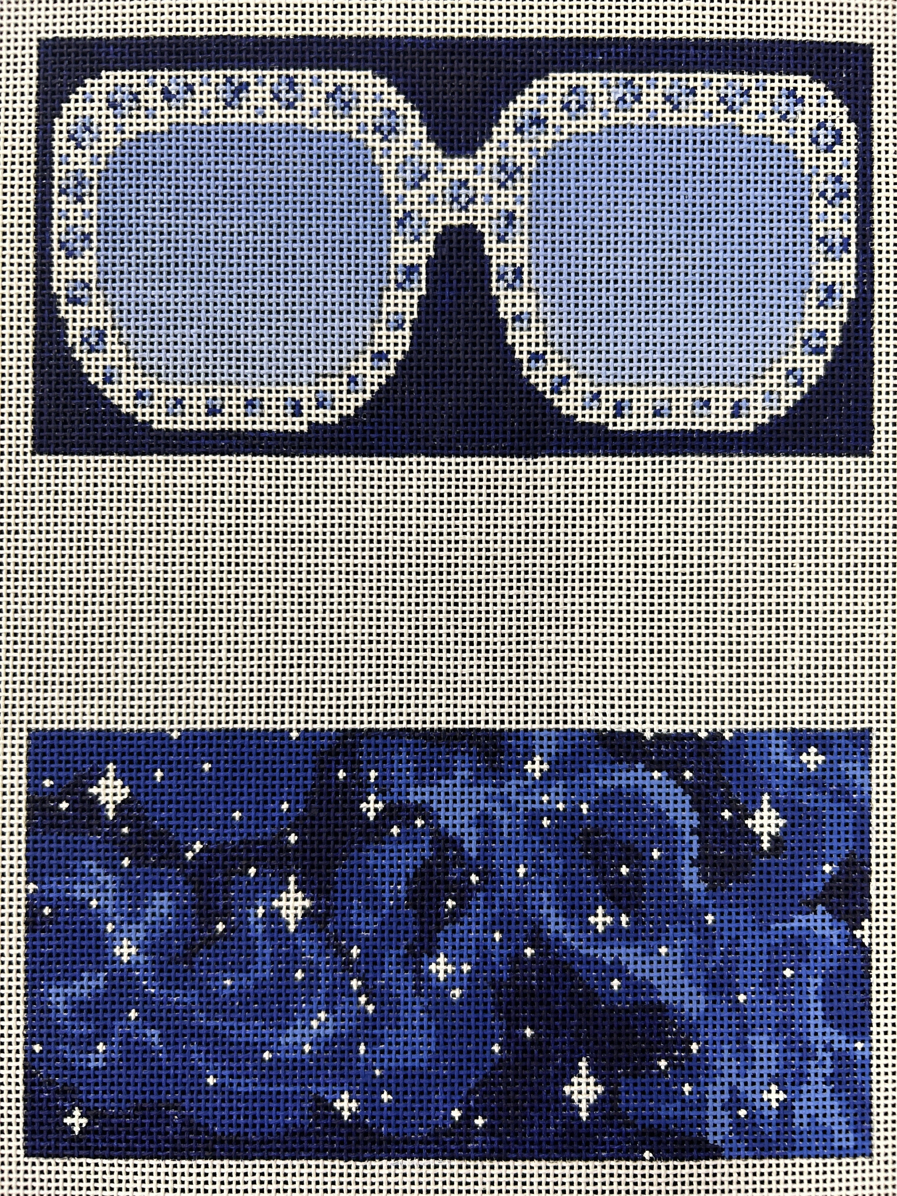 This hand painted needlepoint canvas by Rittenhouse Needlepoint features a two sided eyeglass case inspired by the bold eyewear of this popular musician.