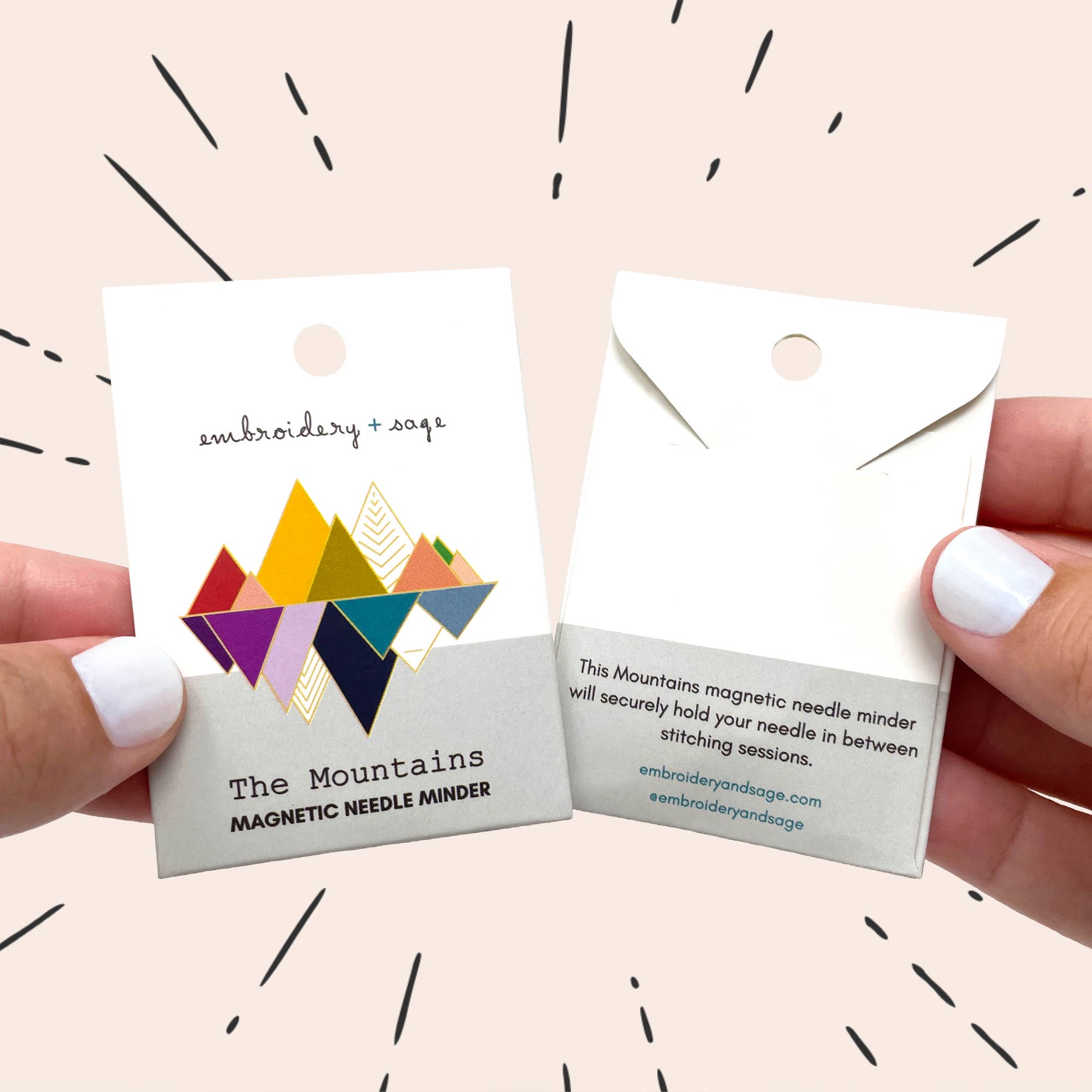 The Mountains needle minder will securely hold your needle in between stitching sessions. Simply place the reflecting mountains on the front of the fabric and hold it in place with the magnet (which sits on the back side of the fabric). Place the needle on top, and voila, you have a majestic spot to mind your needle.