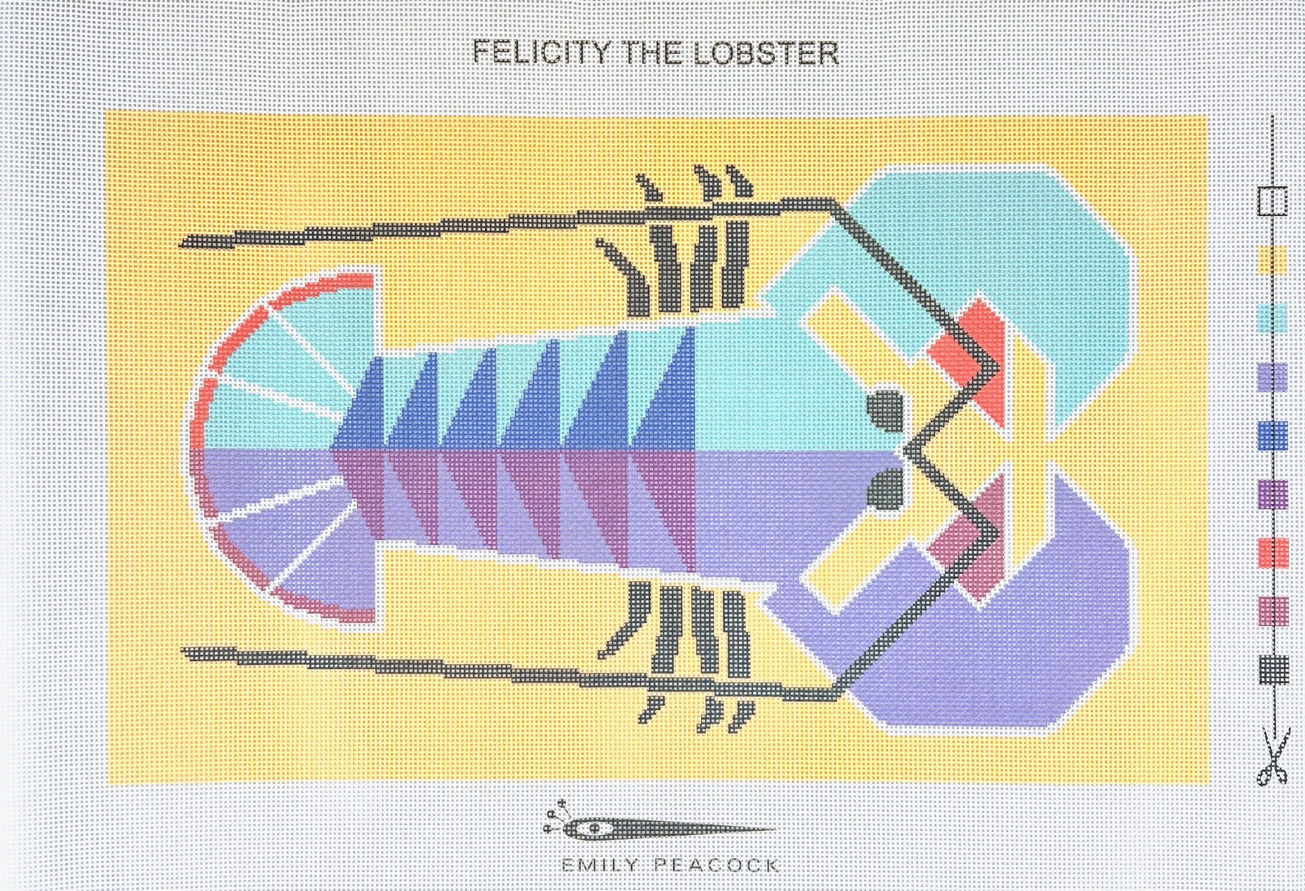 This is a printed needlepoint canvas by Emily Peacock featuring Felicity the Lobster in shades of blue and purple.