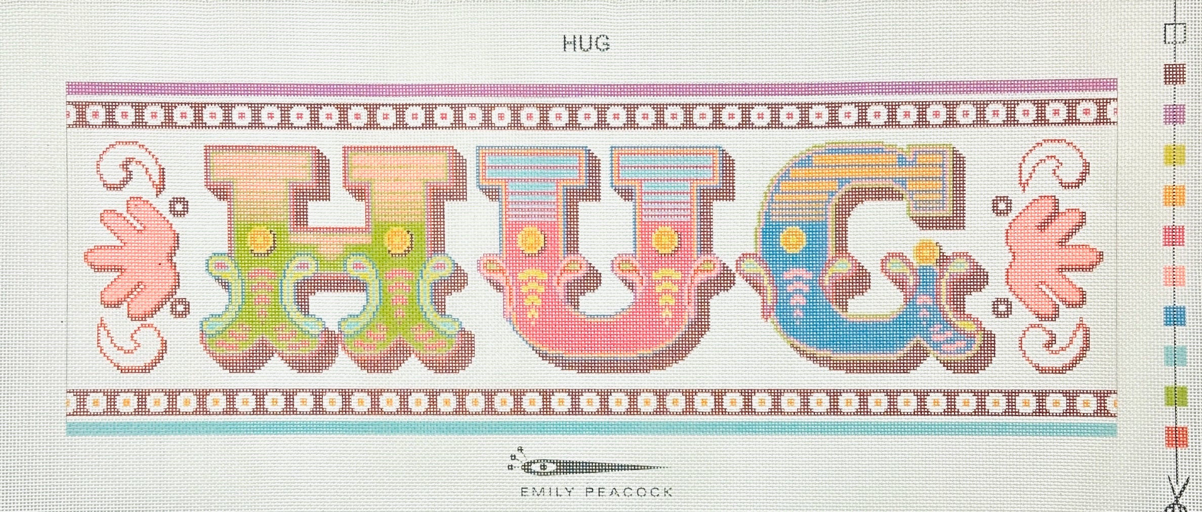 This is a printed needlepoint canvas by Emily Peacock featuring the word "Hug" in ornate letters.