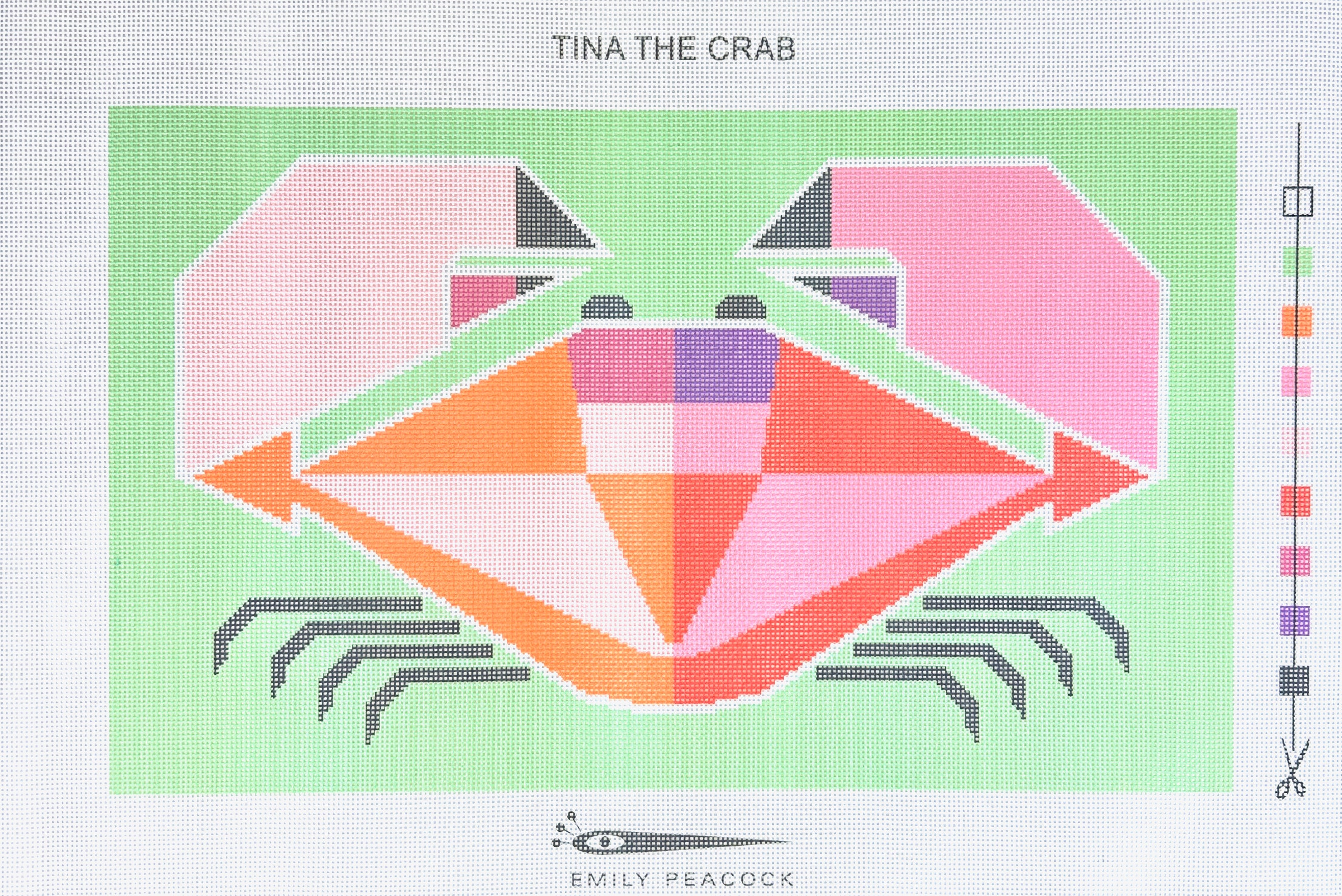 This is a printed needlepoint canvas by Emily Peacock featuring a crab named Tina in shades of pink, orange, and red.