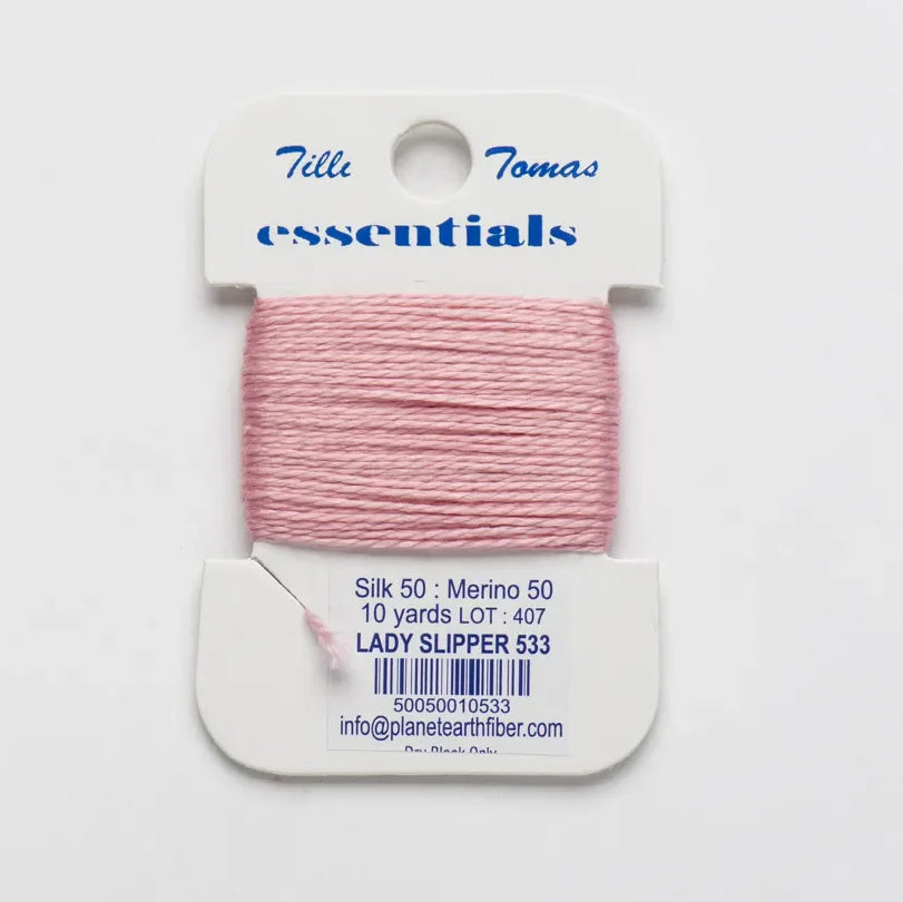 These are Tilli Tomas Essentials from Planet Earth in color 533 Lady Slipper. A silk-wool blend perfect for 18 mesh canvases. 1 ply on 18 mesh. Colors match Milan.