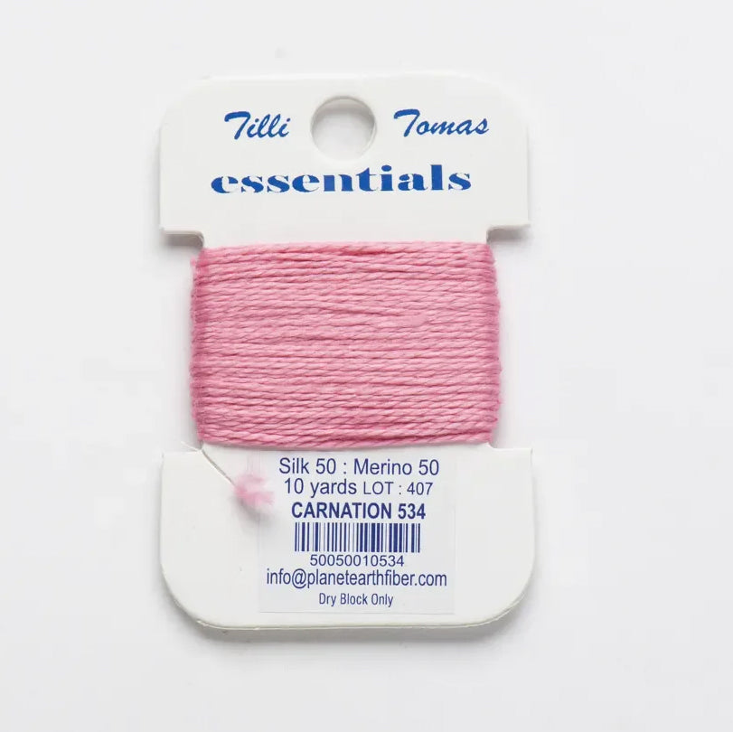 These are Tilli Tomas Essentials from Planet Earth in color 534 Carnation. A silk-wool blend perfect for 18 mesh canvases. 1 ply on 18 mesh. Colors match Milan.