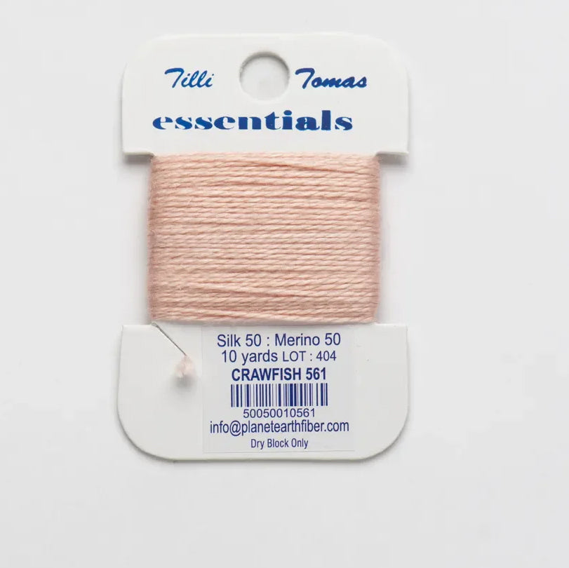 These are Tilli Tomas Essentials from Planet Earth in color 561 Crawfish. A silk-wool blend perfect for 18 mesh canvases. 1 ply on 18 mesh. Colors match Milan.