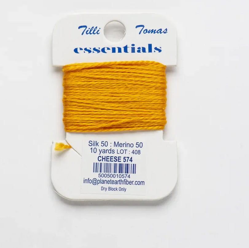 These are Tilli Tomas Essentials from Planet Earth in color 574 Cheese. A silk-wool blend perfect for 18 mesh canvases. 1 ply on 18 mesh. Colors match Milan.