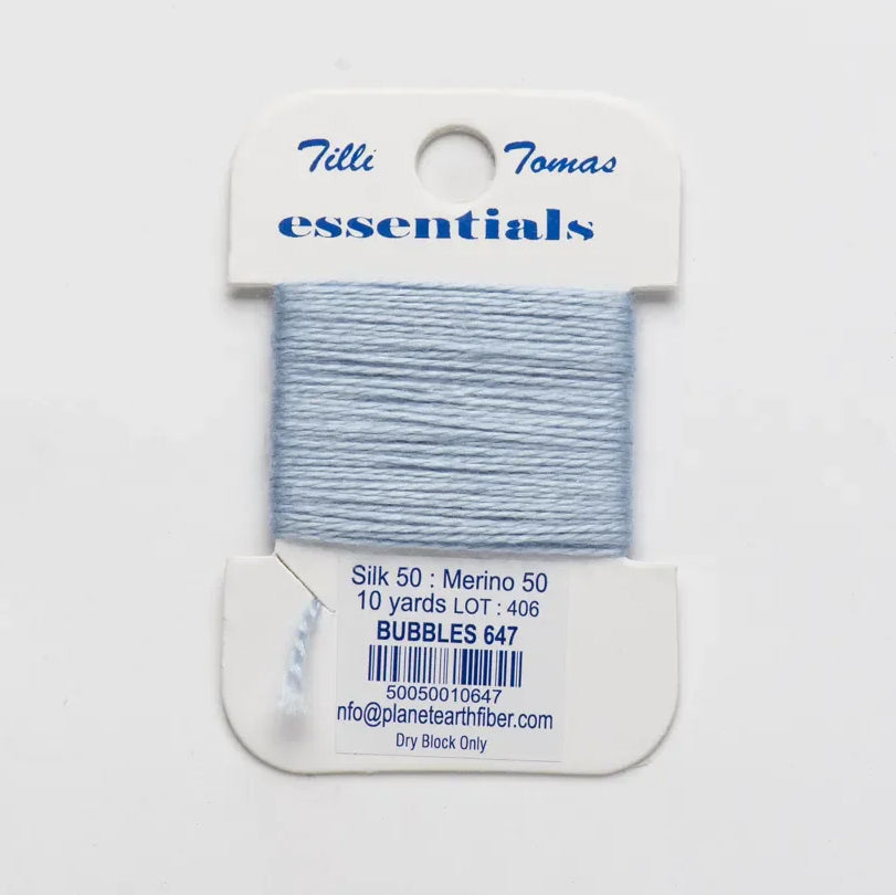 These are Tilli Tomas Essentials from Planet Earth in color 647 Bubbles. A silk-wool blend perfect for 18 mesh canvases. 1 ply on 18 mesh. Colors match Milan.