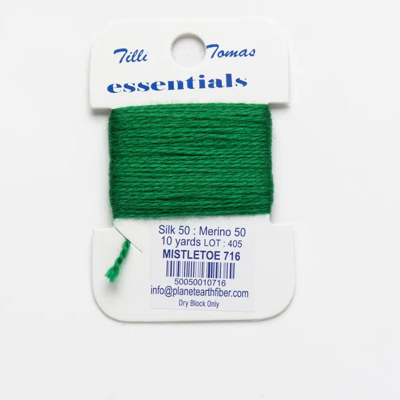 These are Tilli Tomas Essentials from Planet Earth in color 716 Mistletoe. A silk-wool blend perfect for 18 mesh canvases. 1 ply on 18 mesh. Colors match Milan.