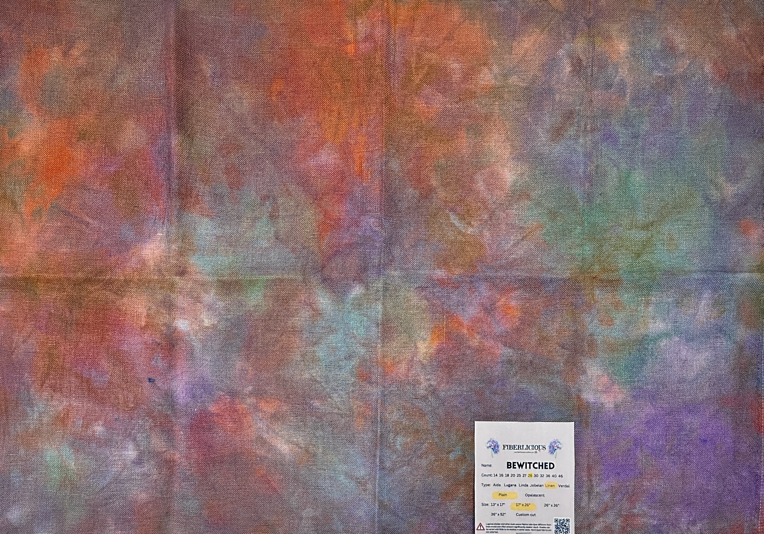 This is hand dyed 28 ct linen cross stitch fabric by Fiberlicious in Bewitched. Embrace the magic of Halloween with Bewitched, a striking hand-dyed fabric that captures the essence of the spooky season. Featuring a vibrant blend of striking green, fiery orange, and haunting purple, this fabric creates a bold and whimsical background, perfect for Halloween and fantasy-inspired cross-stitch projects. Due to the nature of the hand dying process, variations in color and pattern are to be expected. Edges will be serged.