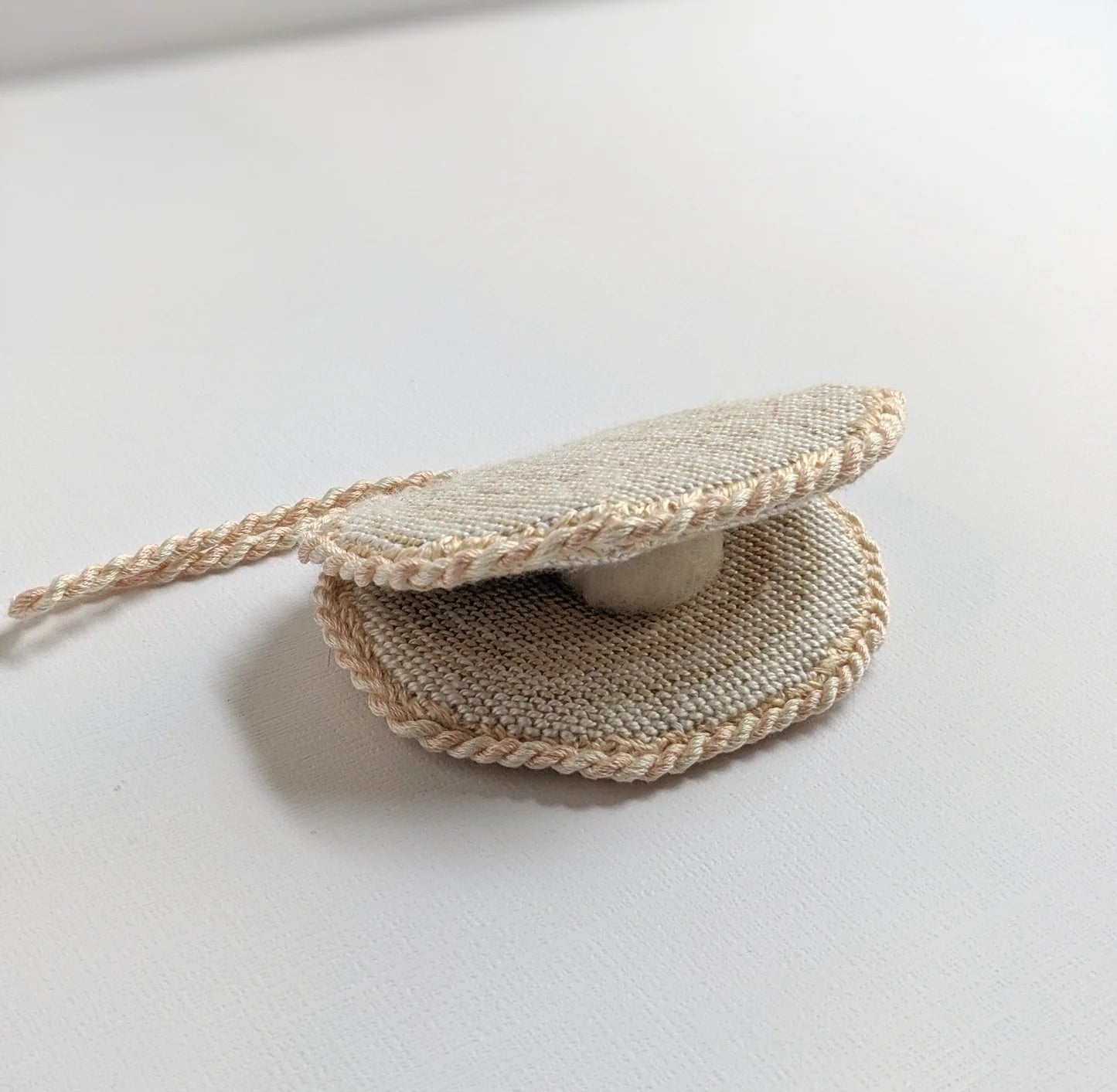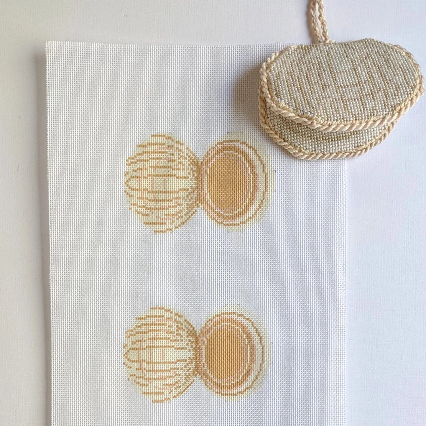 This hand painted needlepoint canvas by Fire and Iris features a 3d clam shell. The canvas has both the front and back of the shell that can be finished together into a dimensional piece with an included pompom to evoke a pearl.
