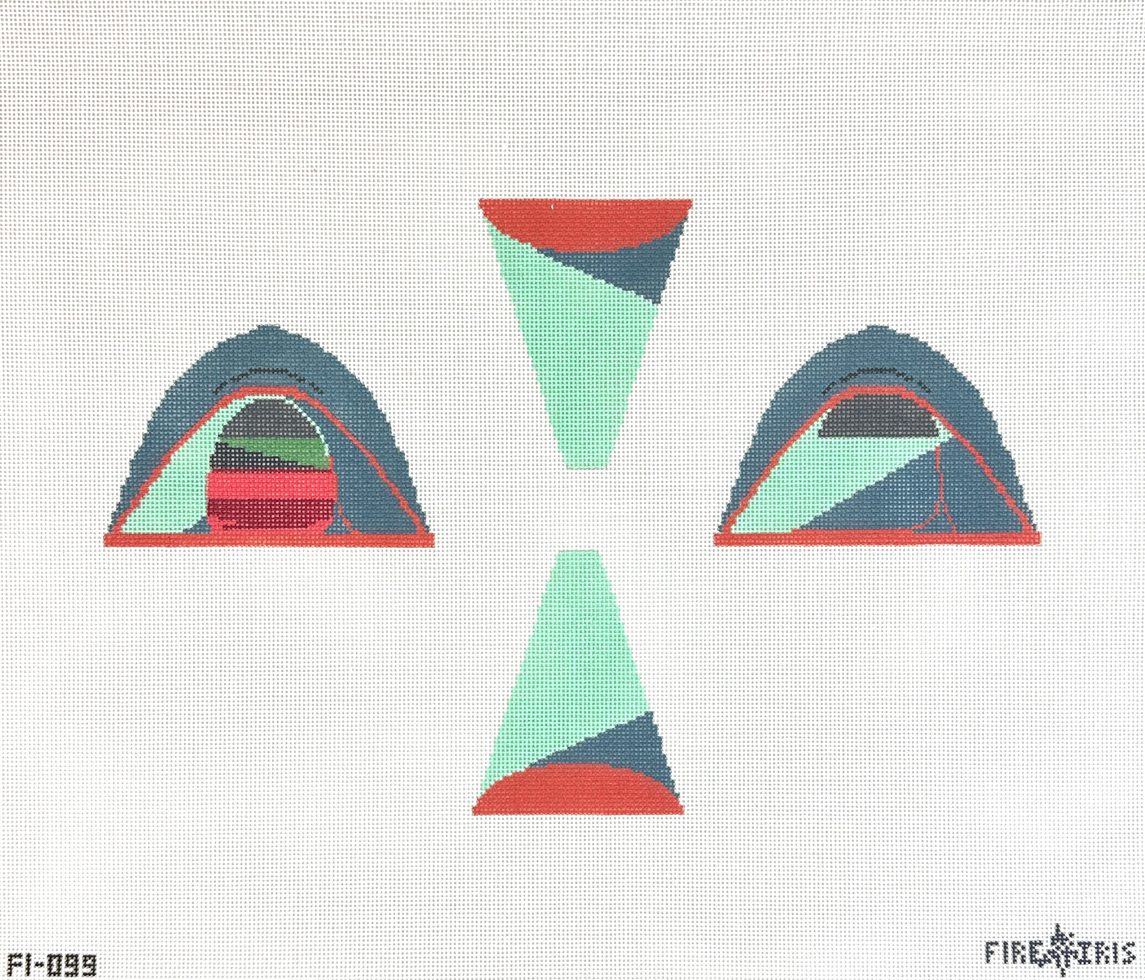 This is a hand painted needlepoint canvas from Fire and Iris. It features a painting of several pieces of a tent, and is intended to be finished as a 3D object. Finished example shown for inspiration, thread and finishing services sold separately.