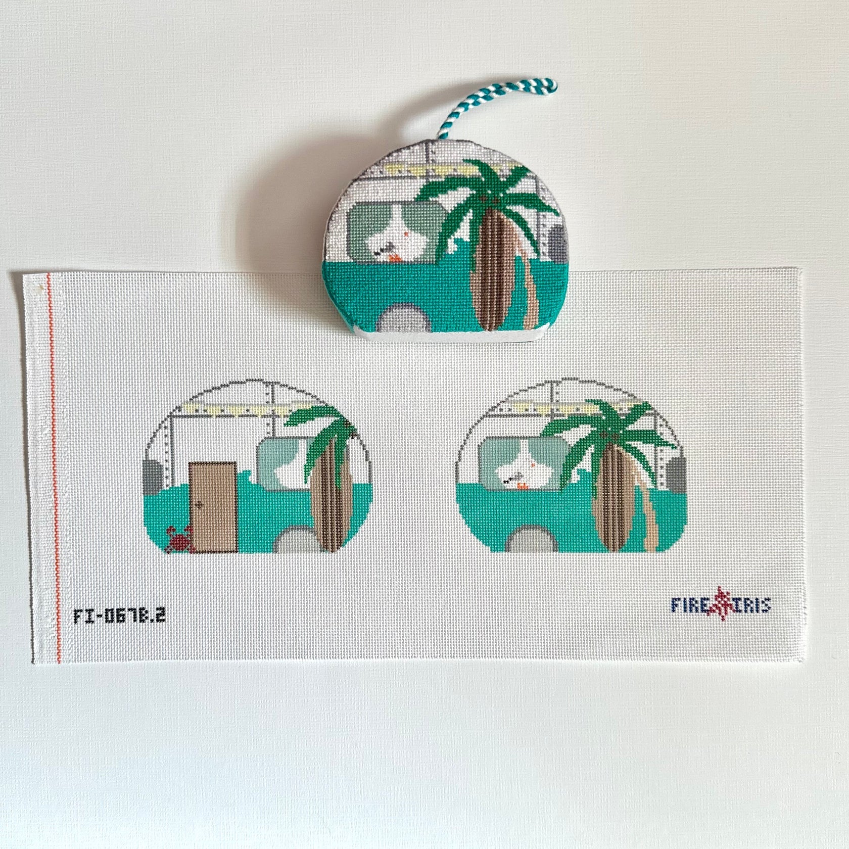 This hand painted needlepoint canvas by Fire and Iris features a classic airstream camper at the beach. It is two sided so that it could be finished into a two sided ornament or stand up.