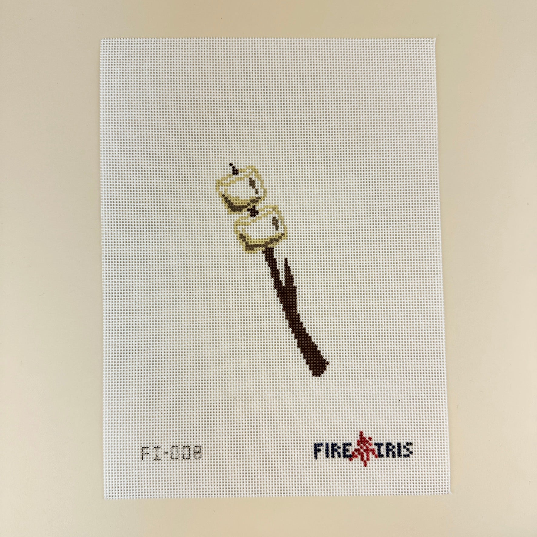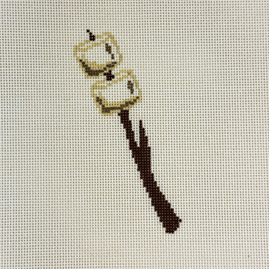 This hand painted needlepoint canvas by Fire and Iris features a pair of marshmallows on a stick ready to be roasted over the fire.