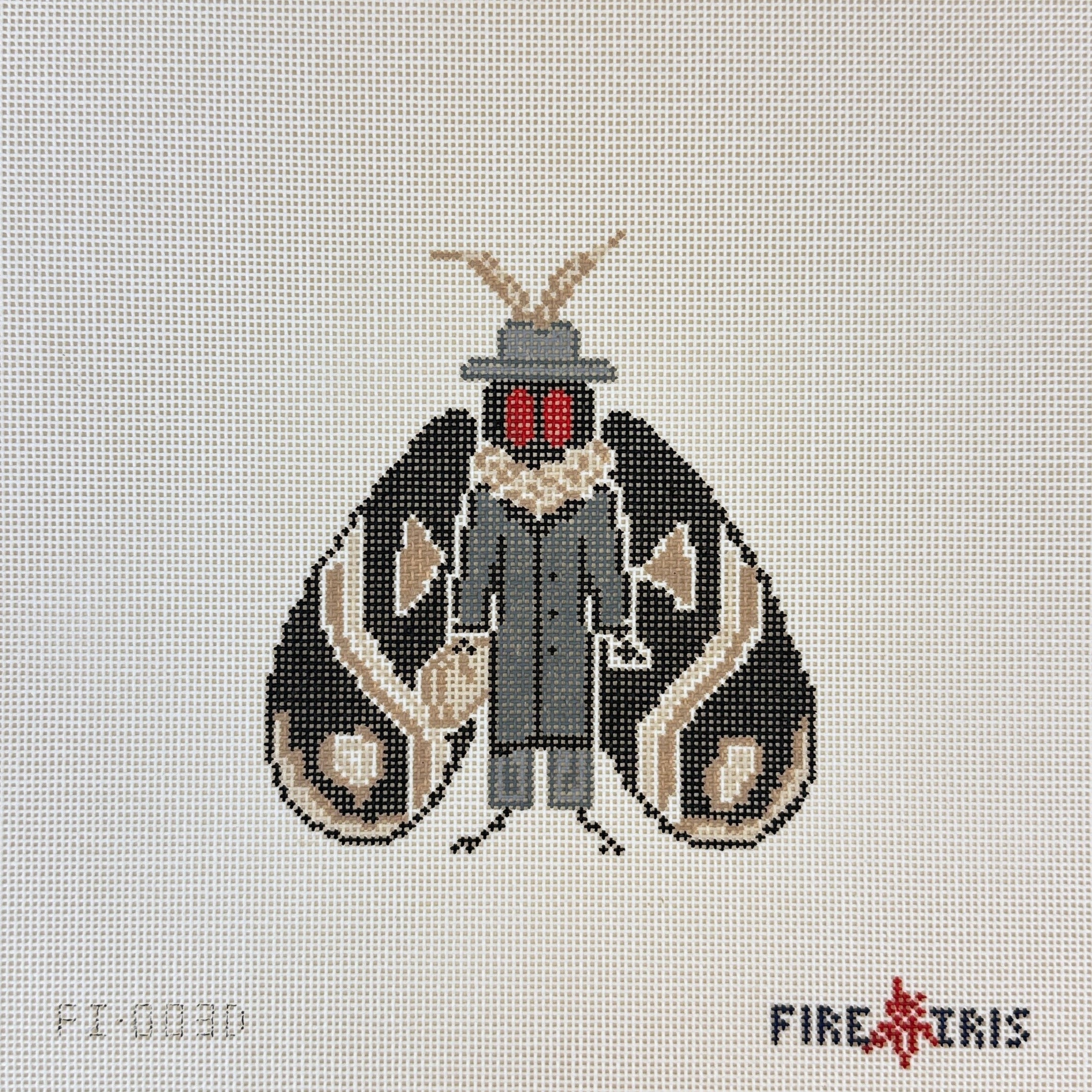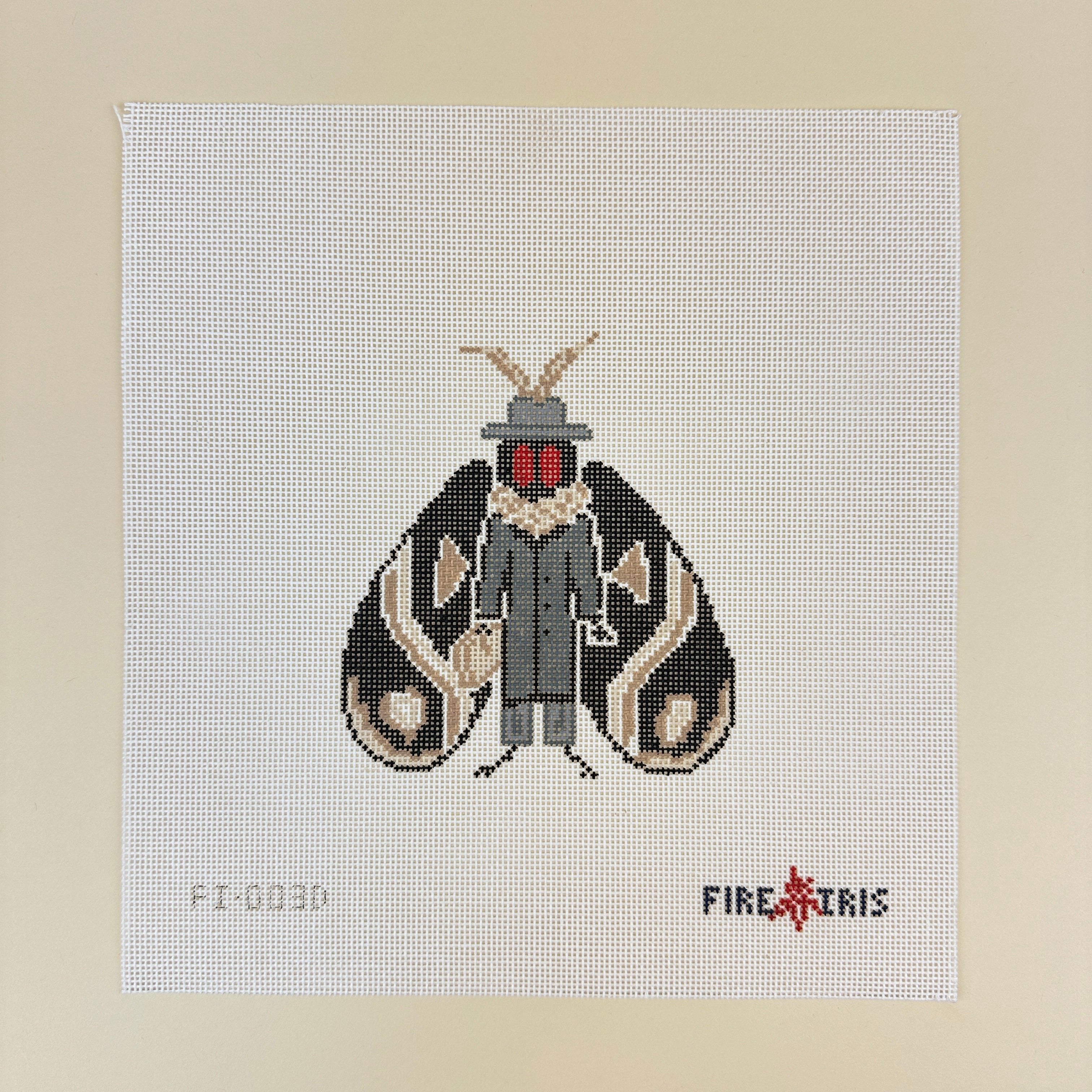 This hand painted needlepoint canvas by Fire and Iris features their unique version of Mothman as a fashionable businessman.