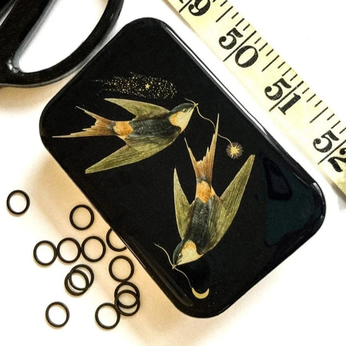 This little notions tin features a vintage image of two swallows. It is perfect for storing needles and other small tools. It has a magnet on the bottom to hold things in place. Small batch design and hand-poured resin from Steveston BC. Clicks closed and stays closed in your project bag!