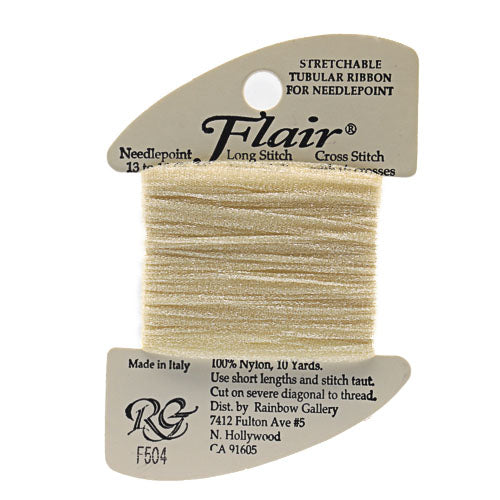 This is Flair from Rainbow Gallery in color 504 True Ecru. A tubular nylon thread, great for tutus and other textures. Works to greatest effect with longer stitches.1 ply on all sizes.