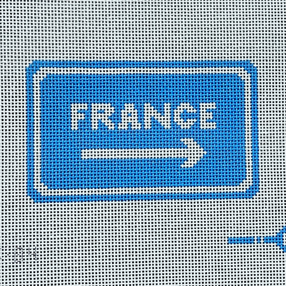 This hand painted needlepoint canvas by Frances Abel Studio features a sign with France and an arrow.