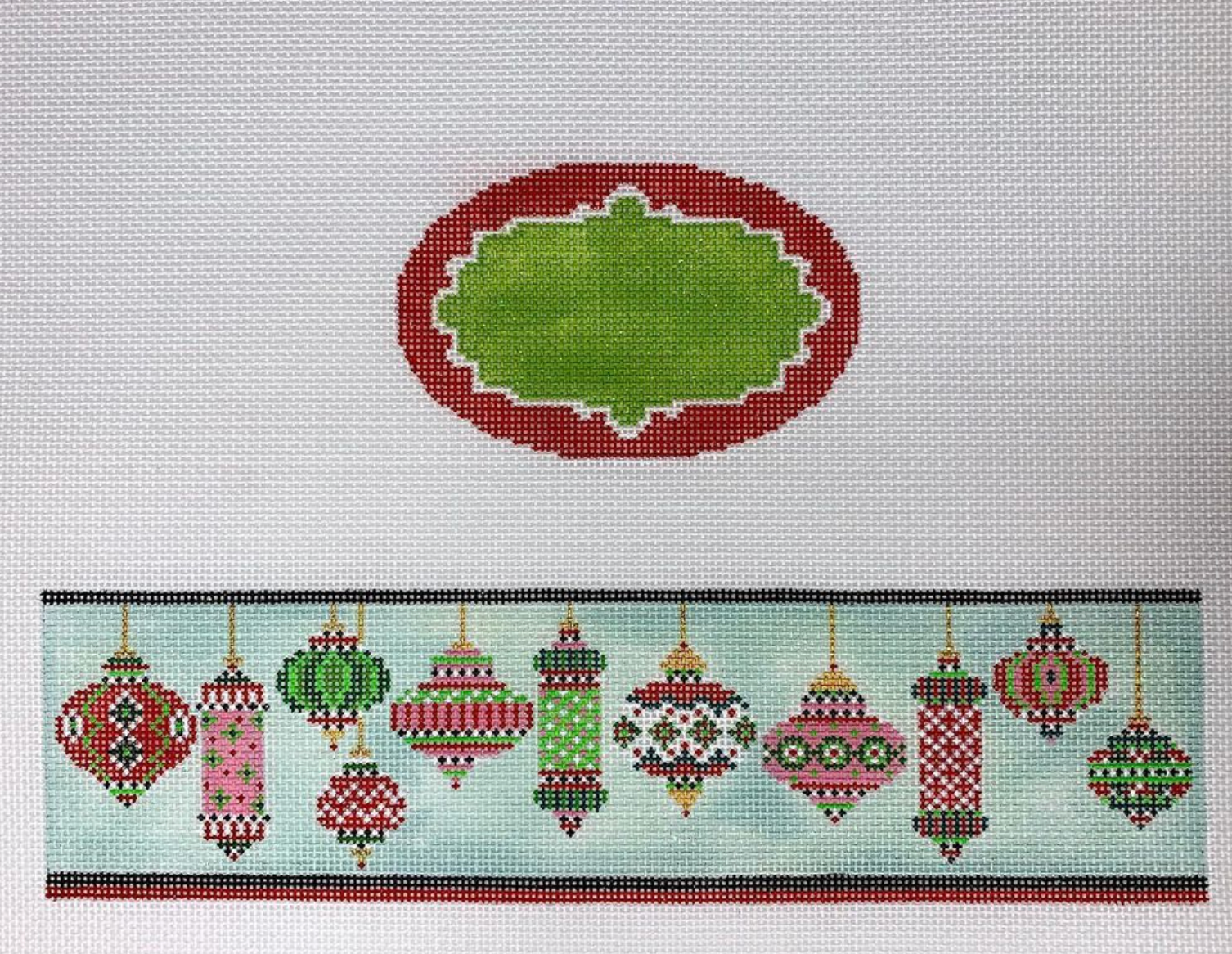 This hand painted needlepoint canvas by Funda Scully is designed to be finished into a oval hinged box. It features a variety of festive Christmas ornaments. Gold hardware is included.