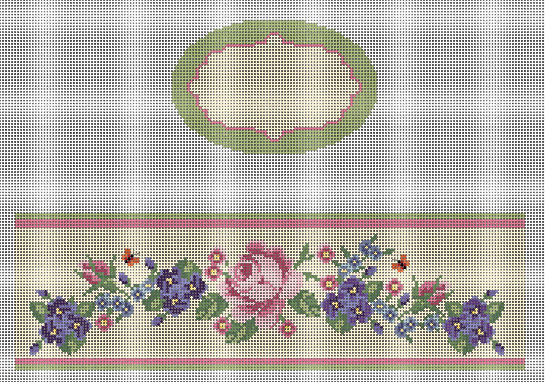 This hand painted needlepoint canvas by Funda Scully is designed to be finished into a oval hinged box. It features a lush floral design with pink roses. Gold hardware is included.