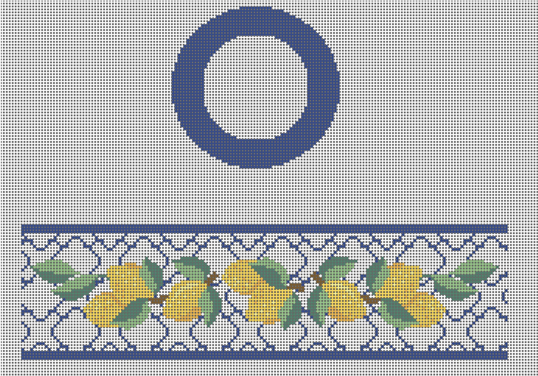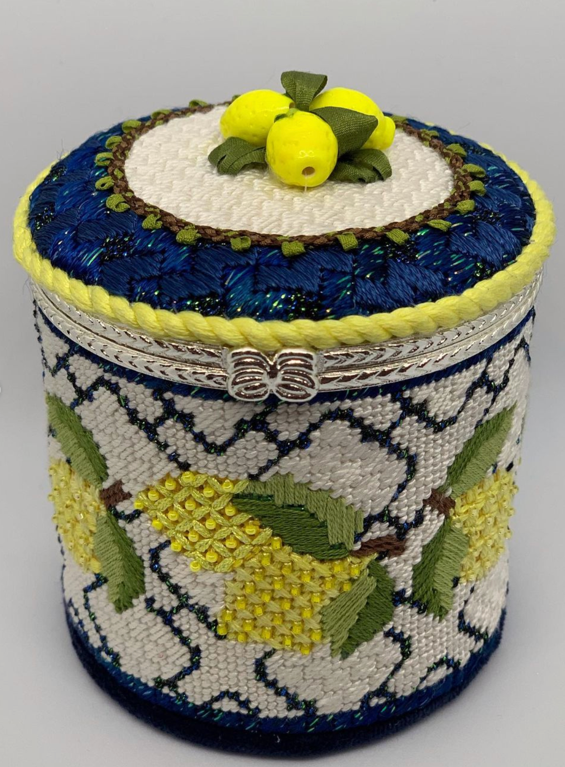 This hand painted needlepoint canvas by Funda Scully is designed to be finished into a round hinged box. It features a sunny lemon pattern. Silver hardware is included.