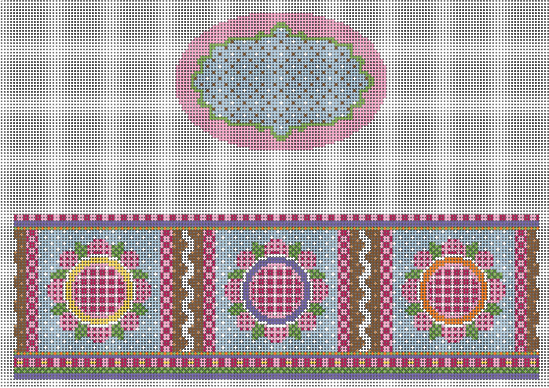 This hand painted needlepoint canvas by Funda Scully is designed to be finished into a oval hinged box. It features a quilt block inspired patterns in cheerful mix of patterns and colors. Gold hardware is included.