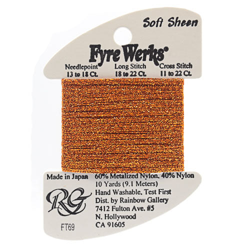 This is Soft Sheen from Rainbow Gallery in color 69 Burnt Orange. 60% metalized nylon, 40% nylon.