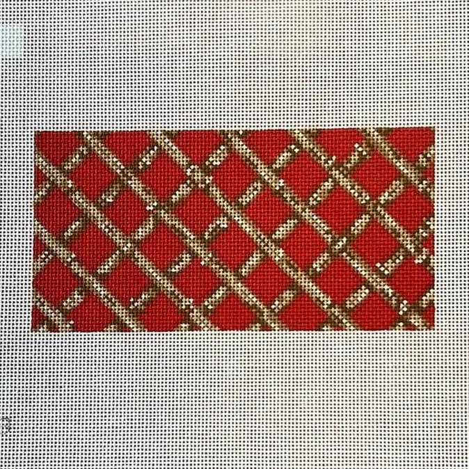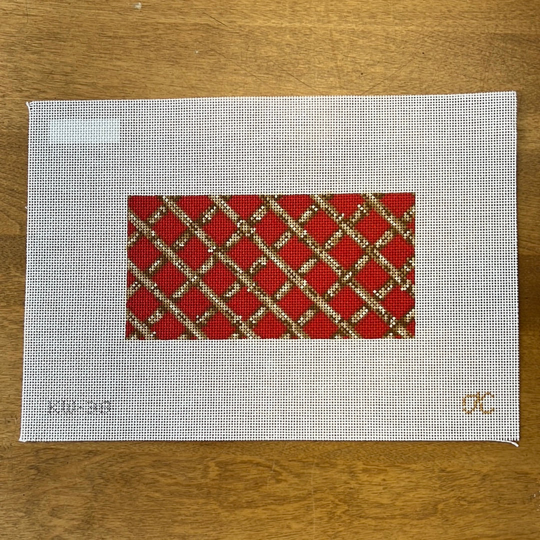 This is a hand painted needlepoint canvas by Kate Woodward for Gingham Stitchery featuring a trellis of bamboo on a red background. It fits the Rachel Barri everyday clutch and other self-finishing pieces that take a 3 x 6 canvas.