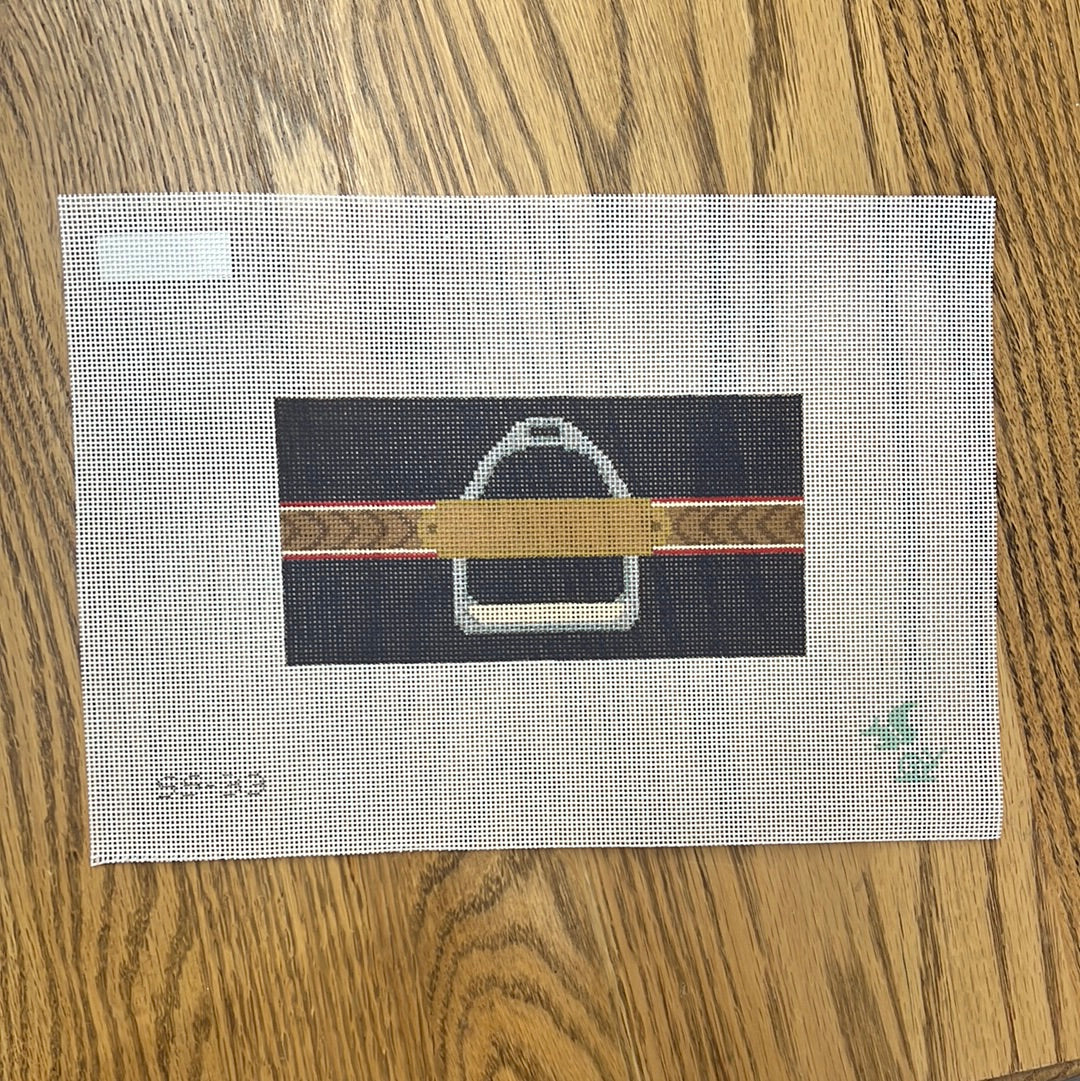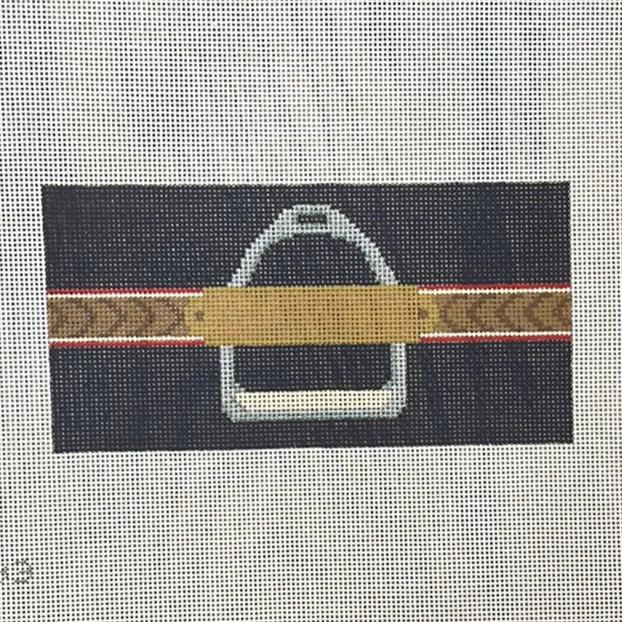 This is a hand painted needlepoint canvas by The Squirrel and The Snail for Gingham Stitchery featuring an equestrian theme of reins and a stirrup with a nameplate that you can personalize. It fits the Rachel Barri everyday clutch and other self-finishing pieces that take a 3 x 6 canvas.