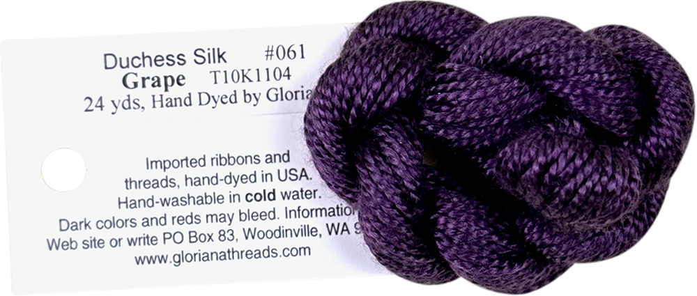 This is Duchess Silk from Gloriana in color 061 Grape. A soft variegated silk that is perfect for 13 mesh! 1 ply on 13 mesh.