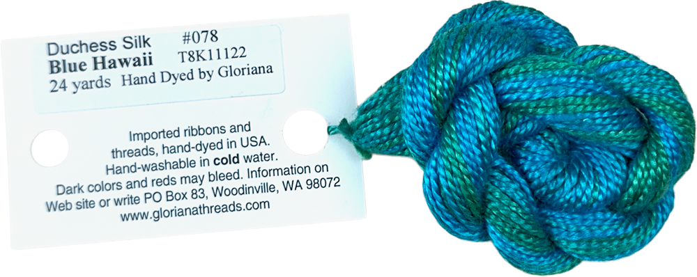 This is Duchess Silk from Gloriana in color 078 Blue Hawaii. A soft variegated silk that is perfect for 13 mesh! 1 ply on 13 mesh.