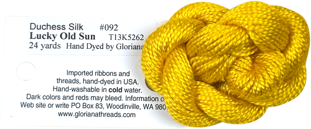 This is Duchess Silk from Gloriana in color 092 Lucky Old Sun. A soft variegated silk that is perfect for 13 mesh! 1 ply on 13 mesh.