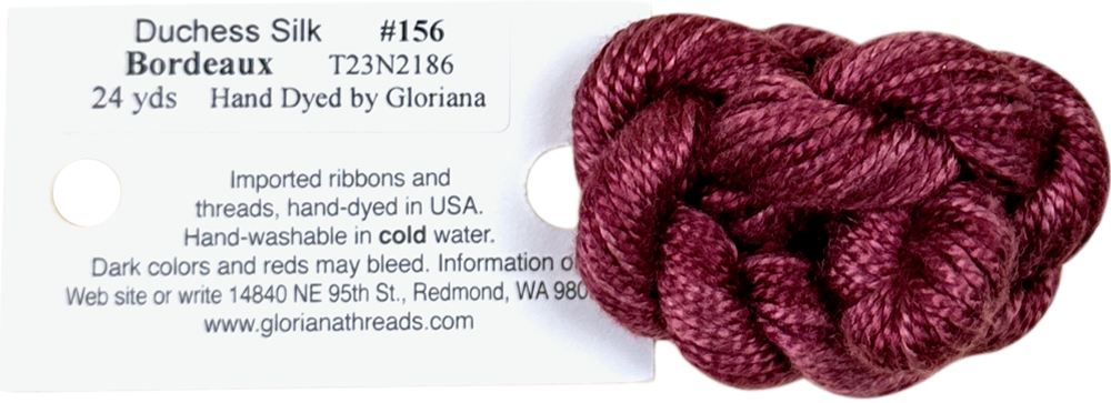 This is Duchess Silk from Gloriana in color 156 Bordeaux. A soft variegated silk that is perfect for 13 mesh! 1 ply on 13 mesh.