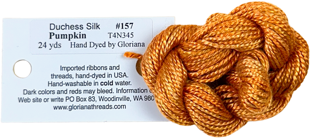 This is Duchess Silk from Gloriana in color 157 Pumpkin. A soft variegated silk that is perfect for 13 mesh! 1 ply on 13 mesh.