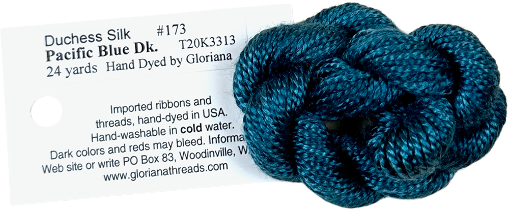 This is Duchess Silk from Gloriana in color 173 Pacific Blue Dark. A soft variegated silk that is perfect for 13 mesh! 1 ply on 13 mesh.